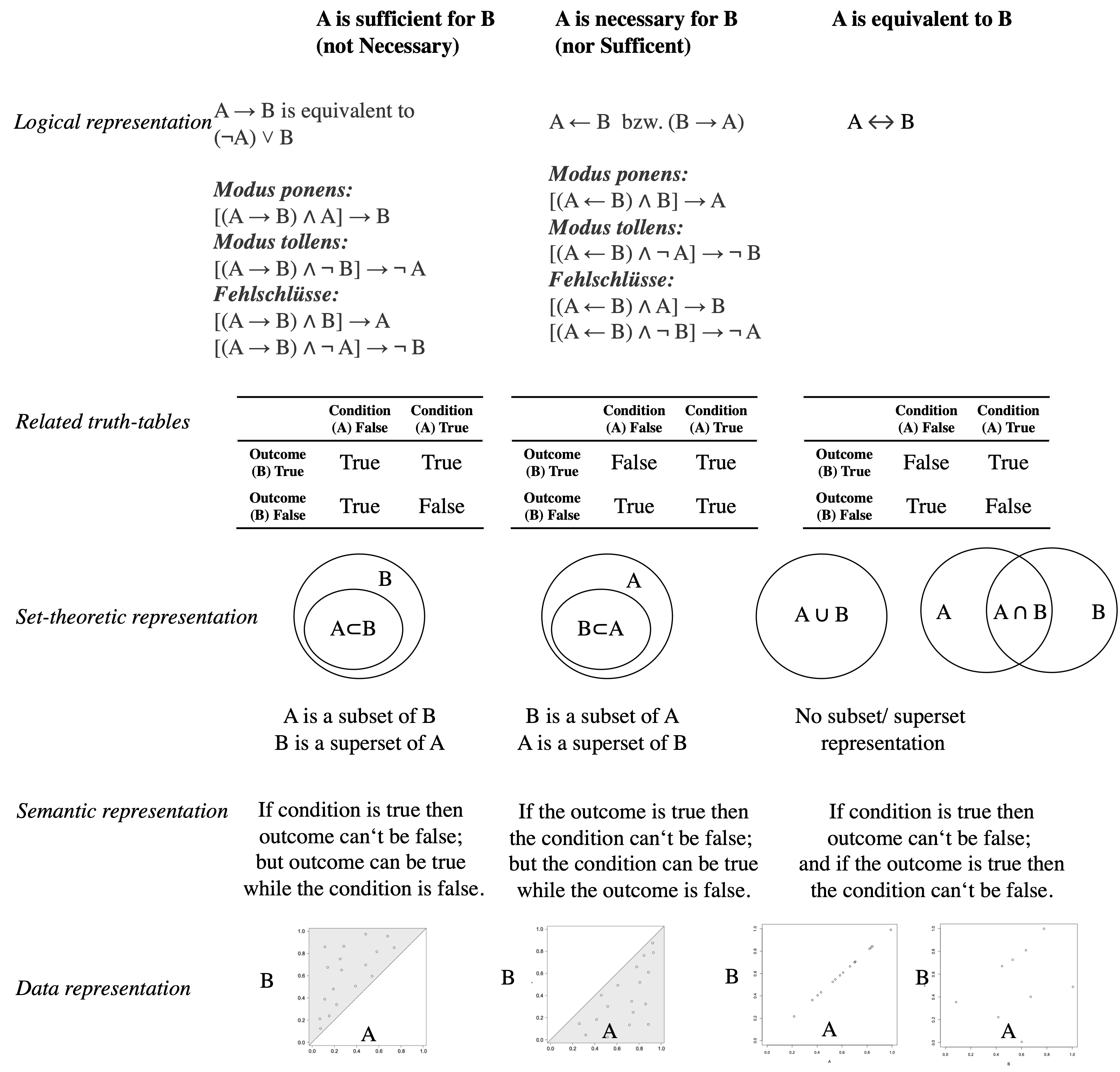 Außerdem zeigt die zweite Zeile der Wahrheitstabelle, dass A (die “Ursache”) auch eine notwendige Bedingung für B ist, wenn: