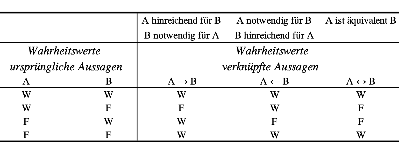 “Liegt eine Äquivalenz \(A \leftrightarrow B\) vor, ist \(A\) hinreichend und notwendig für \(B\), und \(B\) ist hinreichend und notwendig für \(A\).” (Westermann, 2000, S. 75)