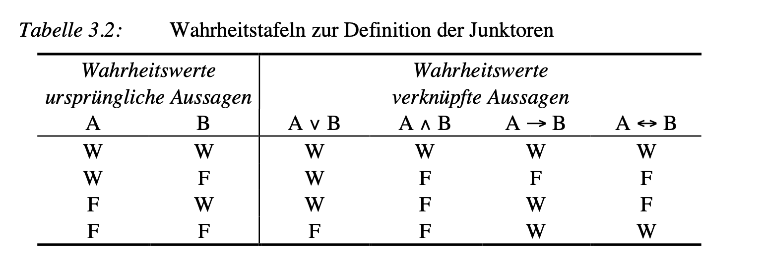 Im folgenden werden die logischen Kombinationen aus zwei Aussagen und die Wahrheitswerte der verknüpften Aussagen (Westermann, 2000, S. 72)
