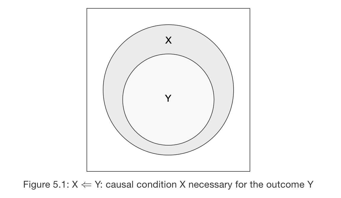 (Dul, 2016, S. 18) schreibt: “The absence of the outcome in cases without the condition is an indication of necessity of X and Y”. Übrigens ist das Fehlen der Bedingung in Fällen ohne Ergebnis auch ein Indiz für die Suffizienz von X und Y.