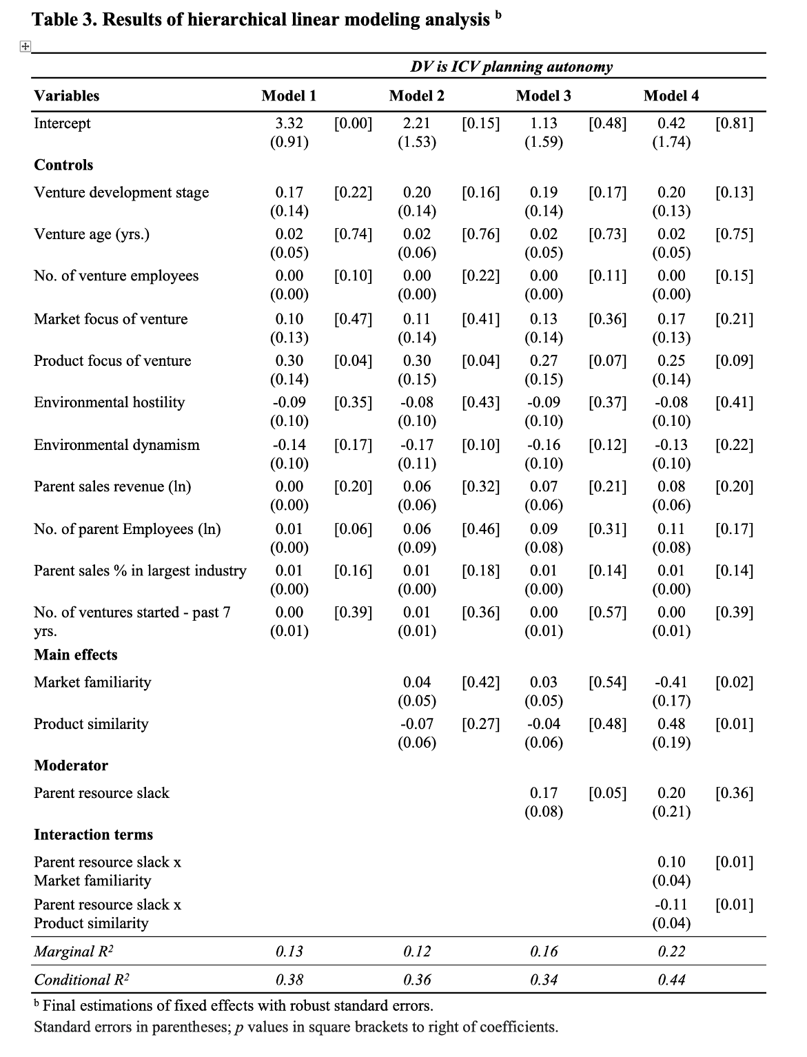 Sie sehen die Ergebnisse von vier Regressionsmodellen.2 Im ersten Modell wurden Kontrollvariablen verwendet, um die abhängige Variable ‘corporate venture planning’ zu prognostizieren. ‘Corporate venture planning’ steht in diesem Artikel für ‘Planungsautonomie’.