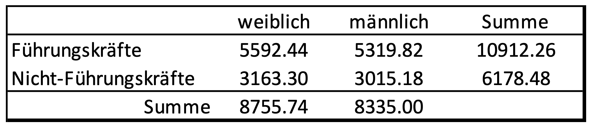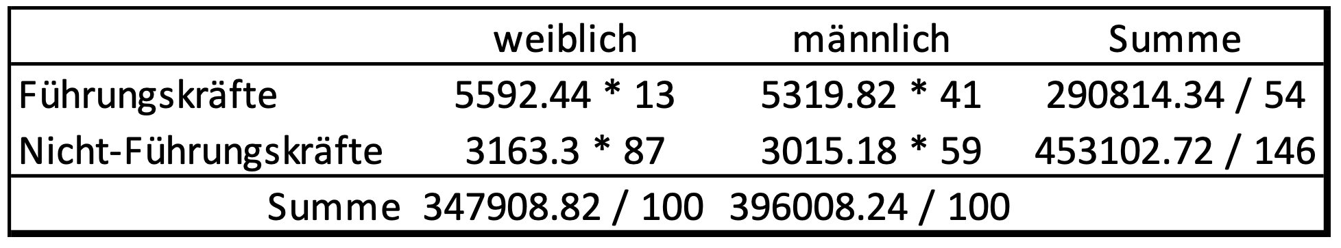In diesem Beispiel wird Geschlechtergerechtigkeit im Sinne von Einkommensgleichheit bei gleicher Tätigkeit angesehen. Tabelle 1 bildet das mittlere Einkommen von weiblichen und männlichen Angestellten unter den Führungskräften und Nicht-Führungskräften ab. Wie zuvor berichtet, zeigt sich ein höherer Lohn sowohl bei weiblichen Führungskräften gegenüber männlichen Führungskräften als auch bei weiblichen Nicht-Führungskräften gegenüber männlichen Nicht-Führungskräften. Ist damit die Frage nach der Geschlechtergerechtigkeit ausreichend geklärt!?