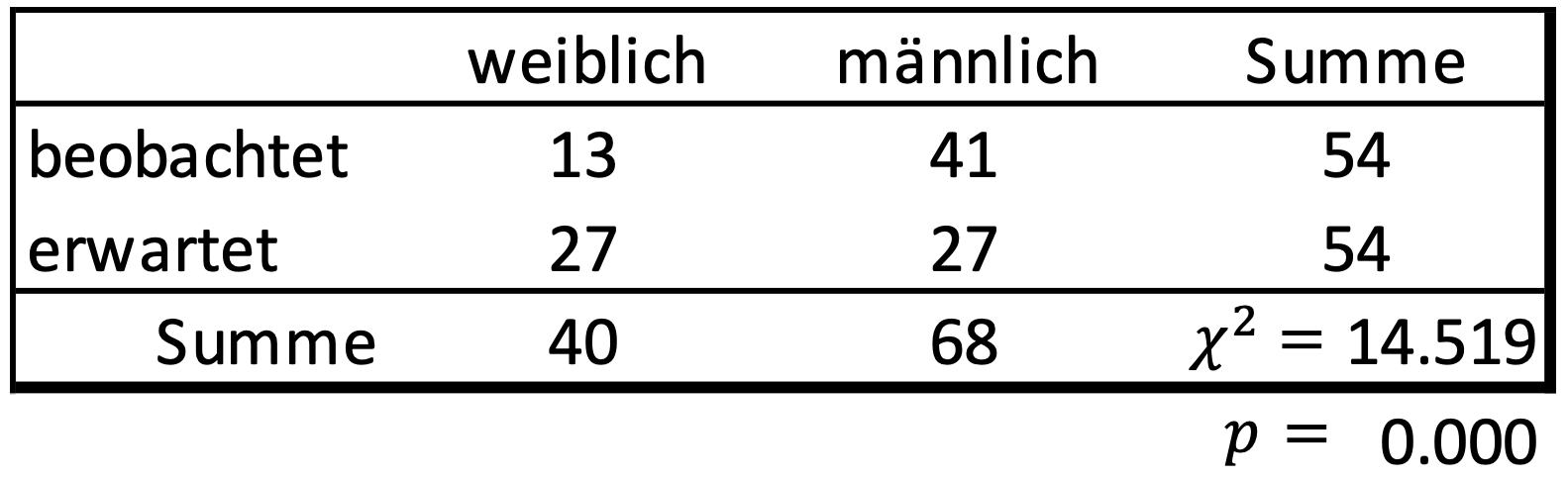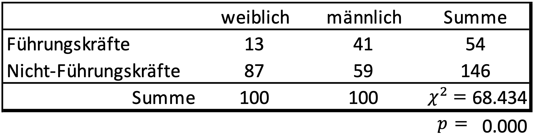 Angenommen in diesem Unternehmen sind 41 männliche und 13 weibliche Führungskräfte angestellt. Kann man davon ausgehen, dass dieser Unterschied zufällig zustande gekommen ist? Die Antwort auf diese Frage ist davon abhängig, wie wir die Nullhypothese formulieren. Man kann einmal überprüfen, ob dieses Zahlenverhältnis mit der H0 vereinbar ist, dass die Anzahl männlicher und weiblicher [Führungskräfte] mit dem allgemeinen Geschlechterverhältnis 50:50 übereinstimmt. Für diesen Fall wäre zu erwarten, dass ebenso viele weibliche wie männliche Mitarbeiter in Führungspositionen angestellt sind. Mit einem \(chi^2\)(df)=14.5(1) und dem korrespondierendem p-Wert ≤0.001 würde das Ergebnis die Nullhypothese (‘Die Anzahl männlicher und weiblicher Führungskräfte stimmt einem Geschlechterverhältnis von 50:50 überein’) zurückweisen.