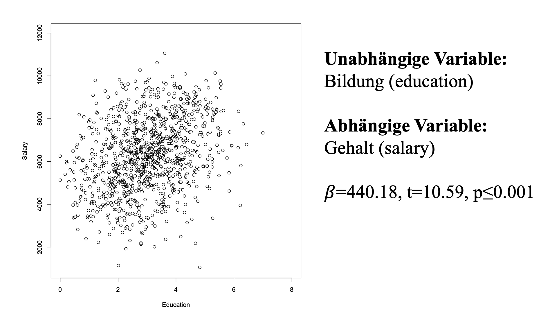 Der Plot des Zusammenhangs von Bildung und Gehalt lässt einen positiven Trend vermuten, der sich in einer Regressionsanalyse bestätigt. Mit einem signifikant positiven Regressionskoeffizienten (\(\beta\)=440.18, t=10.59, p≤0.001) wird ein positiver Zusammenhang zwischen Bildung und Gehalt aufgezeigt.