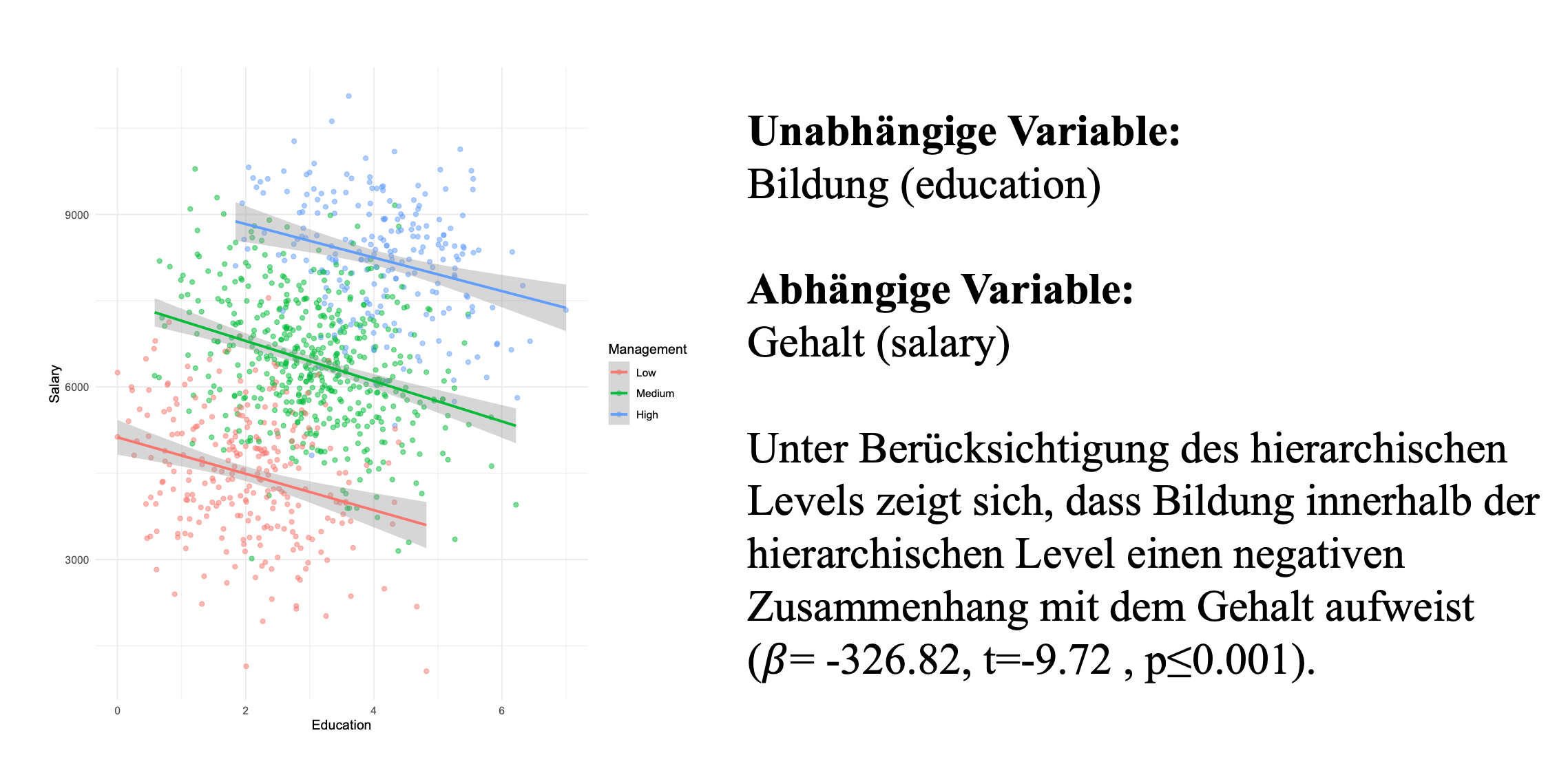 Betrachten wir die gleiche Fragestellung unter Berücksichtigung hierarchischer Level, also auf unterschiedlichen Ebenen des Managements, weist die Analyse ein gegenteiliges Ergebnis hin. Auf allen drei hierarchischen Stufen wird ein negativer Zusammenhang zwischen Bildung und Gehalt erkennbar. Über derartige Aspekte der Datenstruktur sollten wir uns im Folgenden immer bewusst sein.