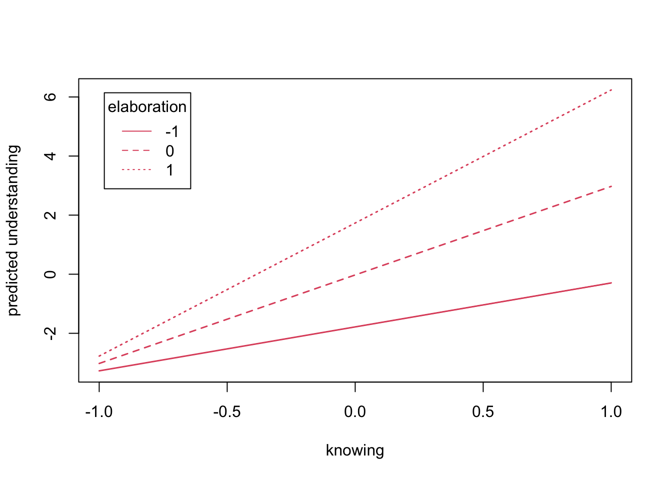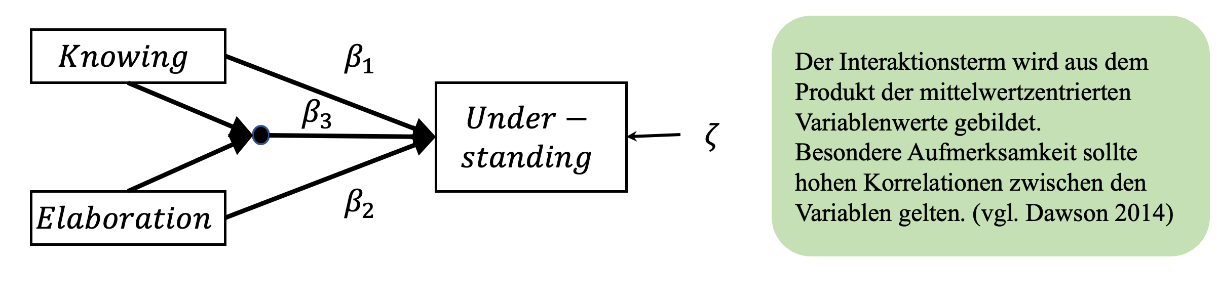 Häufig sind Hypothesen nicht hinsichtlich einer Interaktion formuliert (hier ‘Wissen und Vertiefung interagieren positiv auf das Verständnis’) sondern sind auf klare Zuordnung von unabhängiger Variable und Moderator ausgerichtet (hier ‘Der positiver Einfluss von Wissen auf das Verständnis wird durch hohe Elaboration verstärkt’). Diese Formulierung bezeichnet eine konditional abhängige Beziehung zwischen Wissen und Verständnis durch Elaboration.