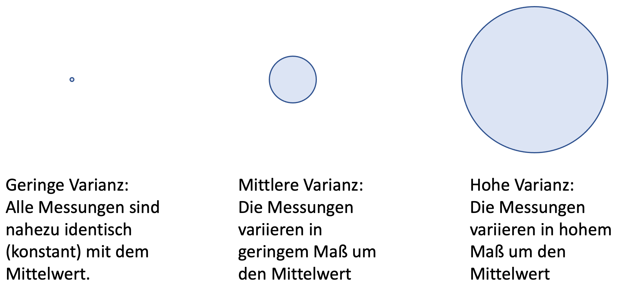 Der erste Kreis ist extrem klein (nahezu ein Punkt). In diesem Fall liegt eine sehr kleine Varianz vor, d.h. die einzelnen Messungen entsprechen nahezu dem Mittelwert bzw. es könnte sich um eine Konstante handeln. Der zweite und der dritte Kreis stehen für größere Varianzen, also größere Abweichungen der einzelnen Messungen vom Mittelwert.