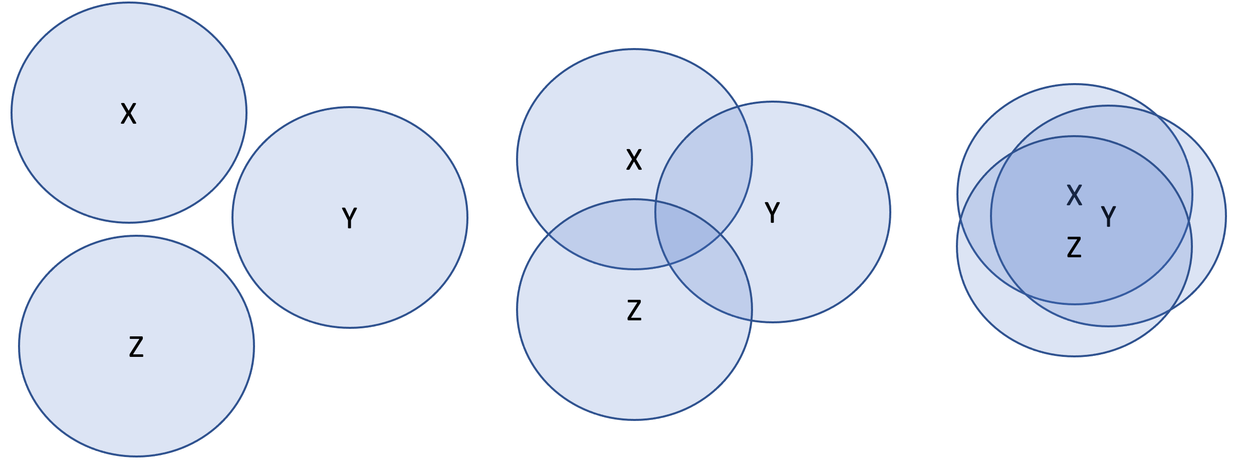 Diese zweite Abbildung weist auf unterschiedlich starke Korrelationen hin. Links in der Abbildung weisen die Varianzen der Variablen X, Z und Y keine Überschneidungsbereiche auf. Eine Korrelationsanalyse würde Koeffizienten von 0 ergeben. In der mittleren Darstellung weisen die Varianzen von X und Z und Z und Y sowie X und Y geringe Überschneidungen auf. Dies würde mit geringen Korrelationen einhergehen. In der rechten Darstellung sind diese Überschneidungsbereiche bzw. Korrelationen deutlich höher.