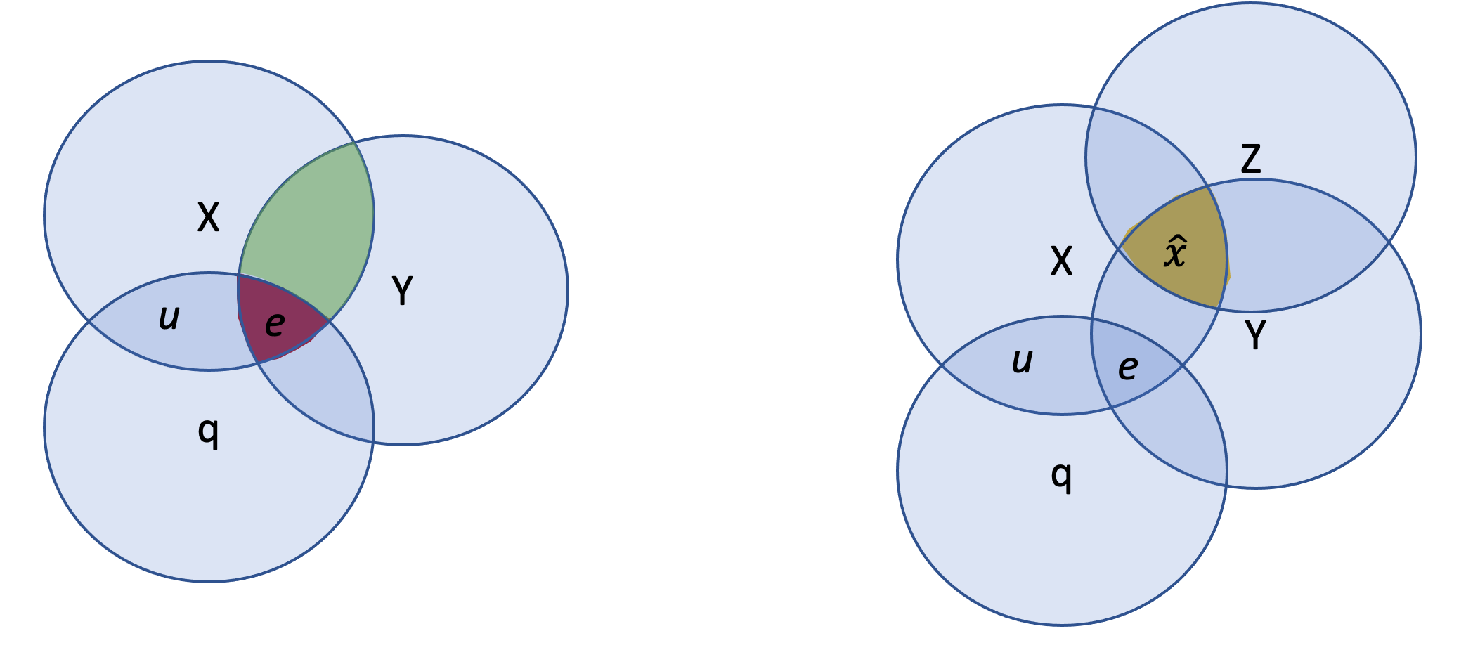 Am Rande sei hier angemerkt, dass eine solche Darstellung von Varianzen in vielen Fällen hilfreich sein kann. In dieser Abbildung wird in Anlehnung an Antonakis (2012) das Grundproblem der Endogenität dargestellt. Links abgebildet sehen Sie, dass die Variable ‘q’ eine gemeinsame Varianz mit X und mit Y aufweist. Wenn ‘q nicht in die Regressionsgleichung einbezogen werden würde, resultiert ein inkonsistenter Koeffizient für X mit Y, und X korreliert mit e. Mit anderen Worten, X würde verwendet um Y zu schätzen, aber Y enthält einen Varianzanteil bezeichnet mit ’e’, der auch in X enthalten ist, aber einen anderen (gemeinsamen) Ursprung hat.