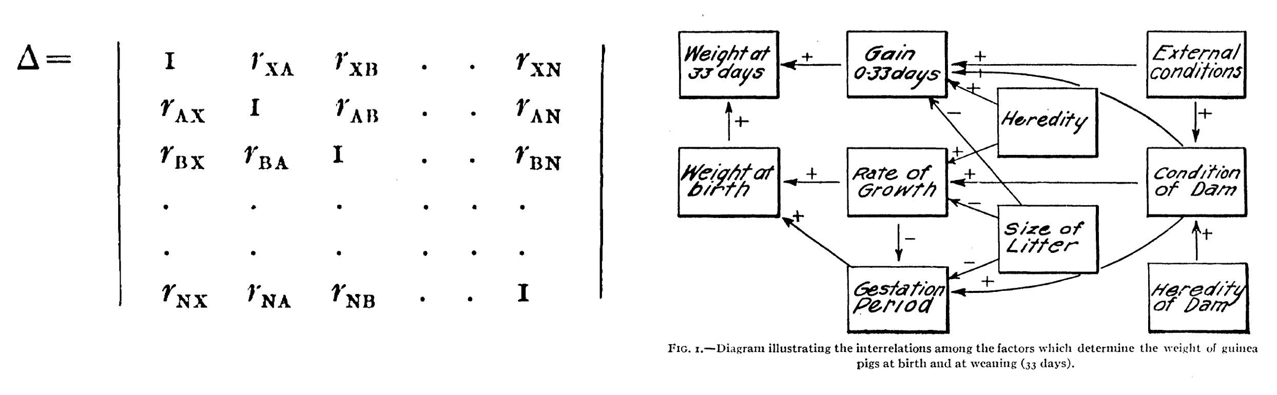 Seine Darstellung von der Gewichtszunahme von Meerschweinchen (Wright, 1921) gilt als erste Darstellung von Korrelationen in Form eines Pfadmodells. Die meisten Variablen sind miteinander durch mehr als einen Pfad verbunden. So korreliert das Gewicht bei der Geburt mit dem Gewicht nach 33 Tagen insgesamt als auch als Wirkung gemeinsamer Ursachen.
