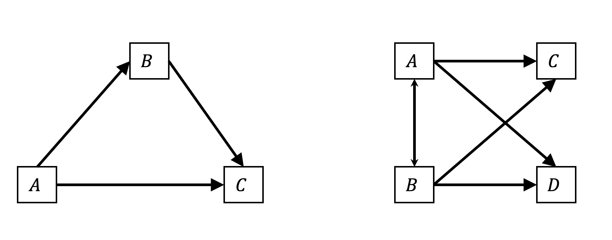 Rechts in der Abbildung ist ein Modell mit vier Variablen dargestellt. A und B sind exogene Variablen. C und D sind endogene Variablen. Dieses relativ einfache Modell kann in dieser Form nicht durch einzelne Regressionen ersetzt werden.