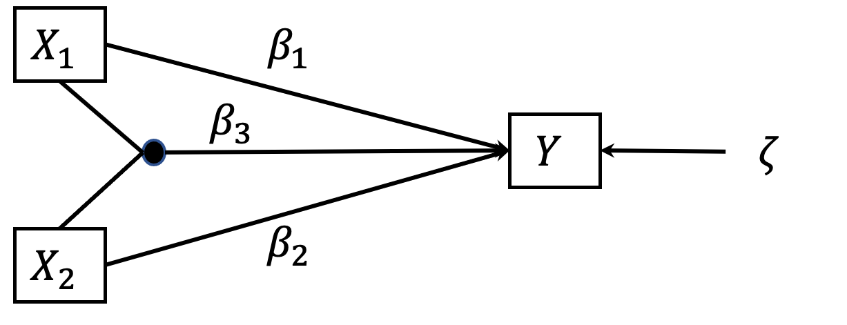 \[ Y=\beta_0 + \beta_1X_1 + \beta_2X_2+\beta_3X_1X_2+\zeta \]