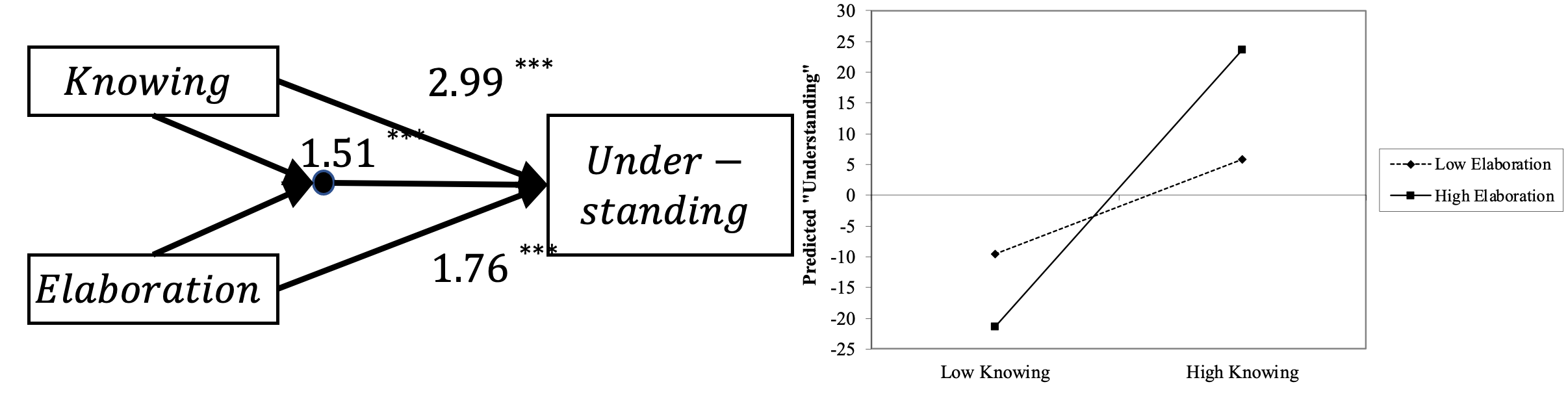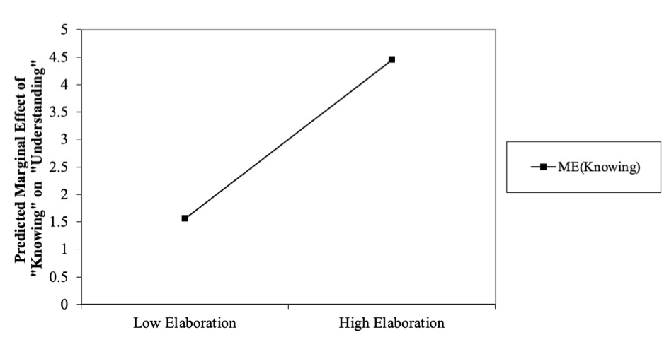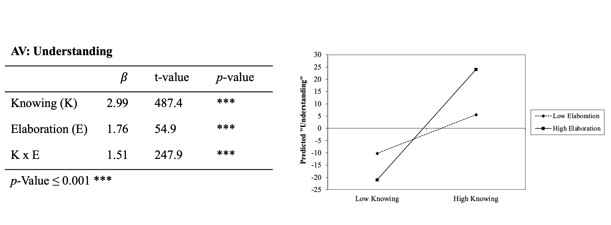 Dies unterstützt die Hypothese 1, nach welcher Wissen und Elaboration in Hinsicht auf das Verständnis interagieren.