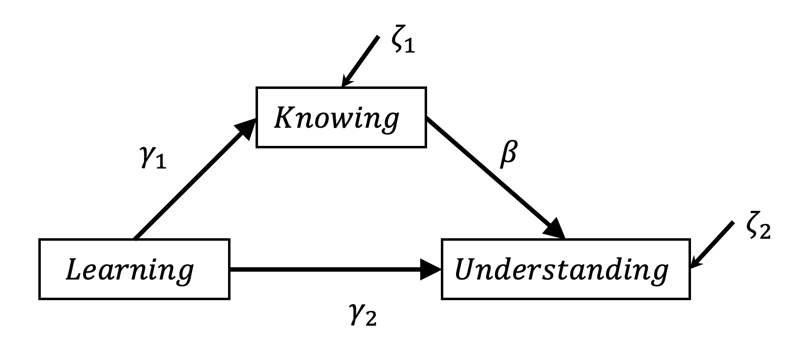 Zuerst soll das bereits besprochene Mediationsmodell von Lernen, Wissen und Verständnis überprüft werden. Wir möchten also an dieser Stelle die Hypothesen überprüfen, dass ‘Lernen das Verständnis fördert’ und das ‘Wissen den Zusammenhang zwischen Lernen und Verständnis’ erklärt, also ein Mediator bzw. eine intervenierende Variable für diesen Zusammenhang darstellt.
