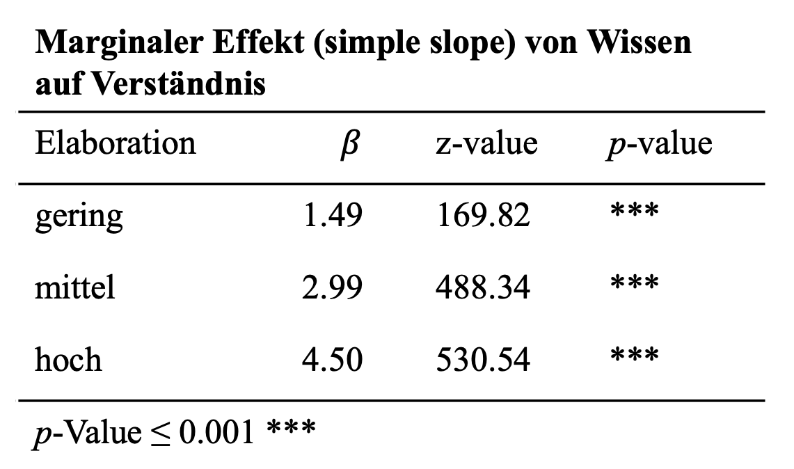 Das Package ‘semTools’ nimmt uns viel Aufwand ab und bestimmt die Effekte von Wissen auf Understanding für unterschiedliche Ausprägungen von Elaboration. Hier wurden die Slopes von Wissen auf Verständnis für drei Ausprägungen von Elaboration getestet. Die Ausprägung ‘geringer Elaboration’ wurde als Mittelwert minus einer Standardabweichung, mittlere Elaboration als Mittelwert und hohe Elaboration als Mittelwert plus eine Standardabweichung definiert.