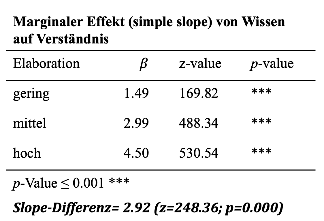 Die resultierende Koeffizienten-Differenz in Höhe von 2.92 (z=248.358; p=0.000) ist signifikant und lässt endgültig die Bestätigung der Hypothese zu, dass hohe Elaboration den positiven Zusammenhang zwischen Wissen und Verständnis signifikant erhöht.