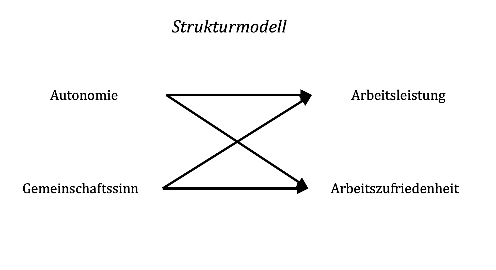Im dargestellten Beispiel sind zwei exogene Variablen (Autonomie und Gemeinschaftssinn) sowie zwei endogene Variablen (Arbeitsleistung und Arbeitszufriedenheit) abgebildet. Vor dem Hintergrund motivationaler Faktoren könnte argumentiert werden, das mit steigender Autonomie Zufriedenheit und Leistung in Arbeitsgruppen gefördert werden (z.B. Cordery, Morrison, Wright & Wall, 2010). Ebenso könnte angenommen werden, dass ein höheres Maß an Gemeinschaftssinn Leistung und Zufriedenheit fördert (z.B. Bouncken, Ratzmann, Barwinski & Kraus, 2020).