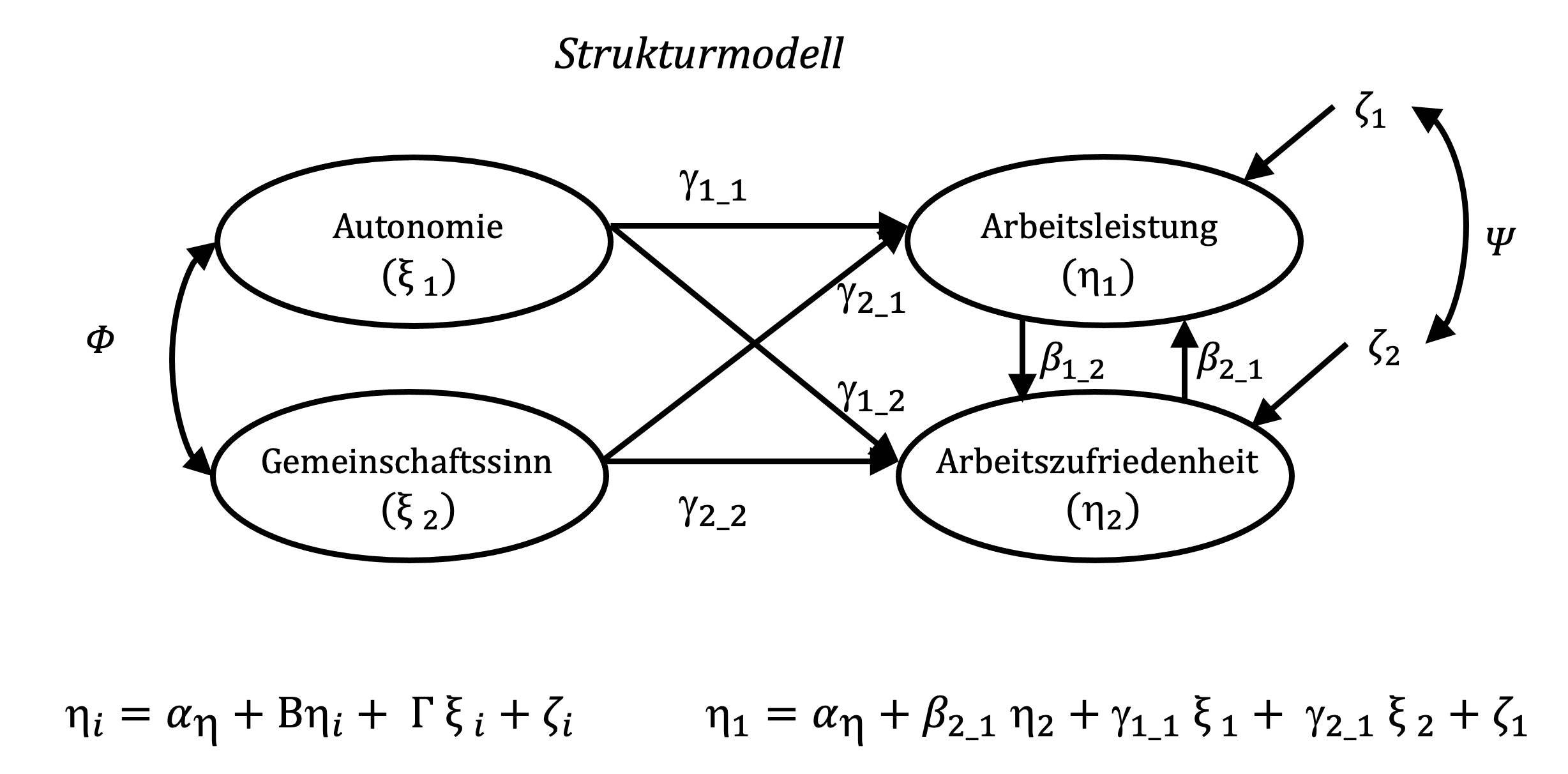 Im Beispiel ergibt sich für die Arbeitszufriedenheit die vereinfachte Modellgleichung: \[\eta_1=\gamma_{11} \xi_1 + \gamma_{21}\xi_2 +\beta_{21}\eta_2 + \zeta_1 \]