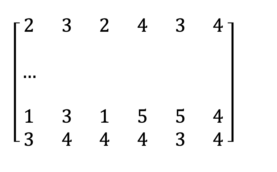 Die entsprechende Datenmatrix sieht wie folgt aus. Die Matrix hat hier eine Dimension von 405 x 6, wobei sich die 405 auf die einzelnen Fälle im Datensatz und die sechs auf die ausgewählten Items beziehen.