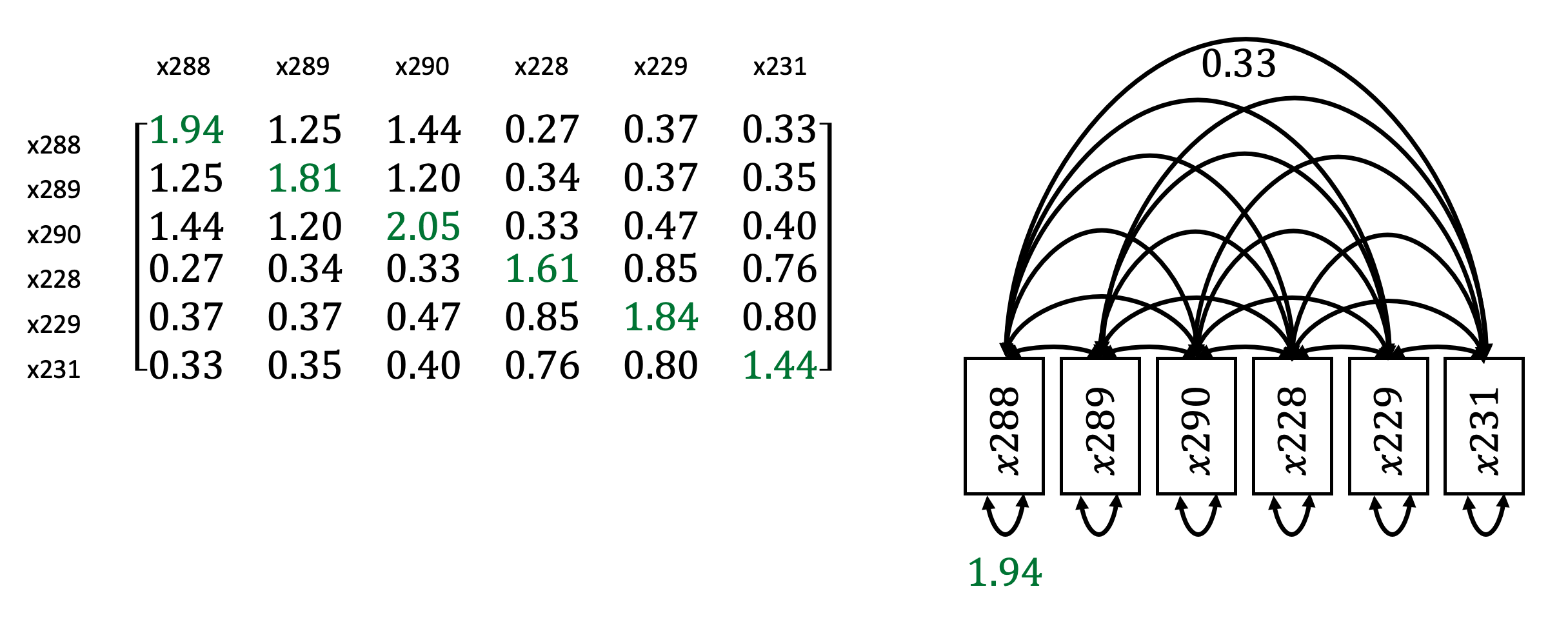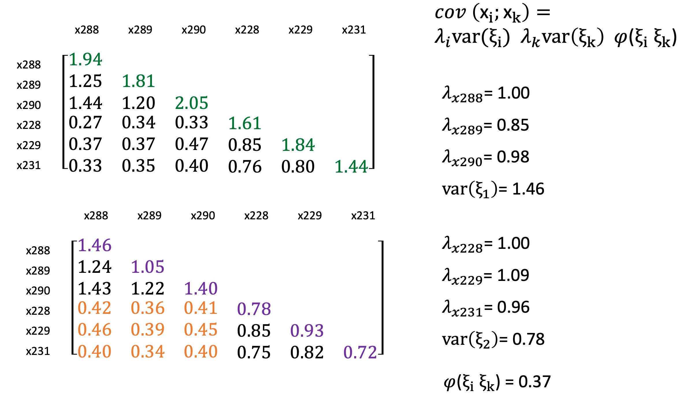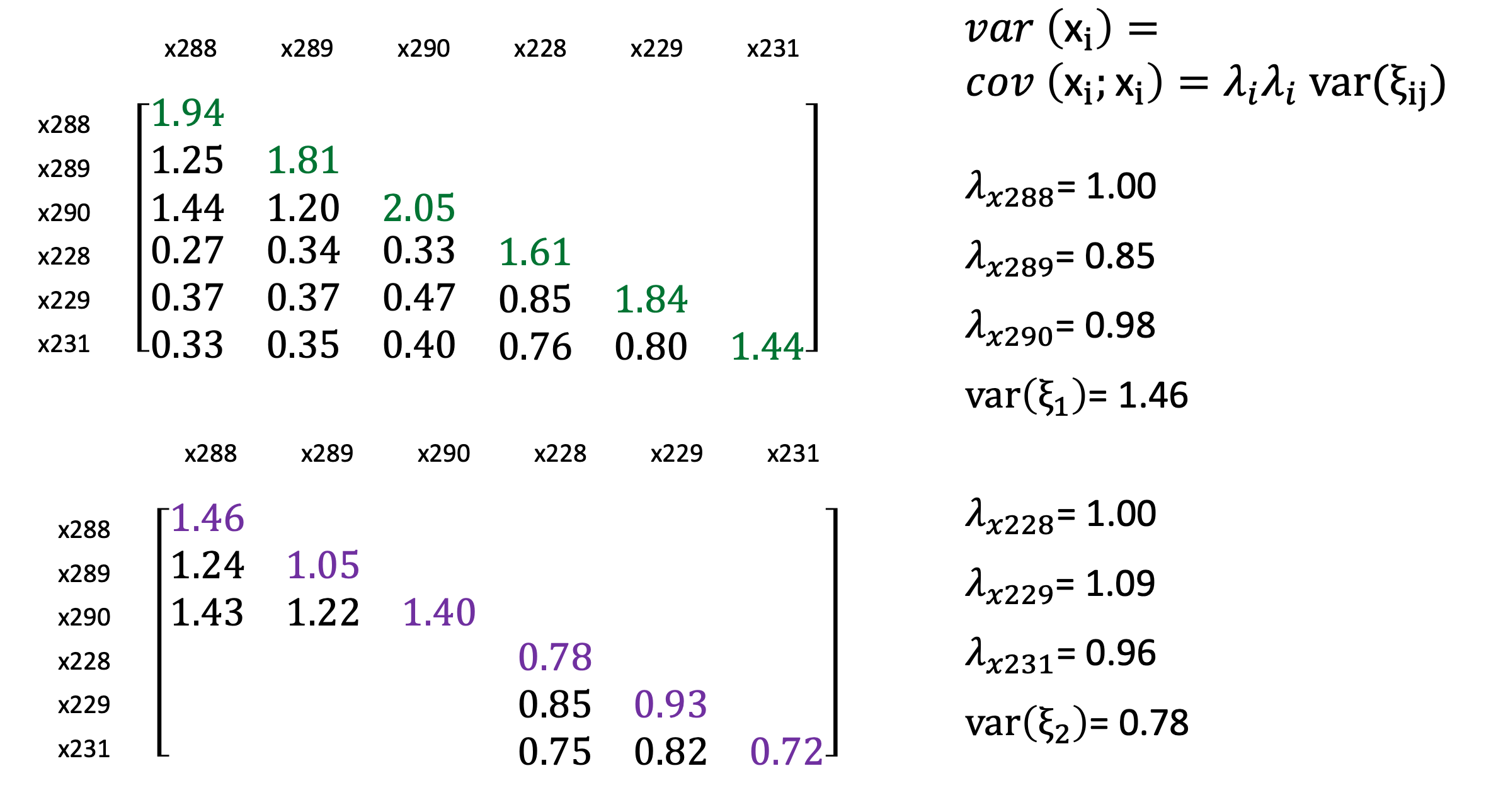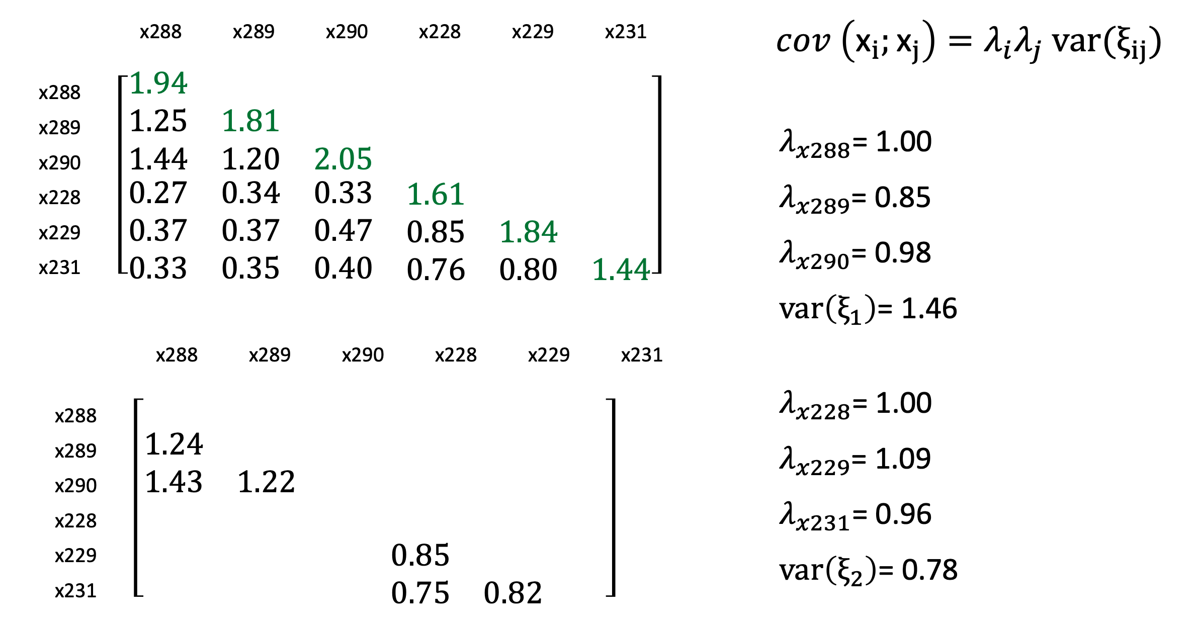 Dieses Beispiel zeigt die empische Kovarianzmatrix der manifesten Indikatoren der latenten exogenen Variablen, wie wir sie schon betrachtet hatten. Die Diagonale spiegelt die Kovarianzen der Indikatoren, da die cov (x288, x289) gleich der cov (x289, x288) ist.