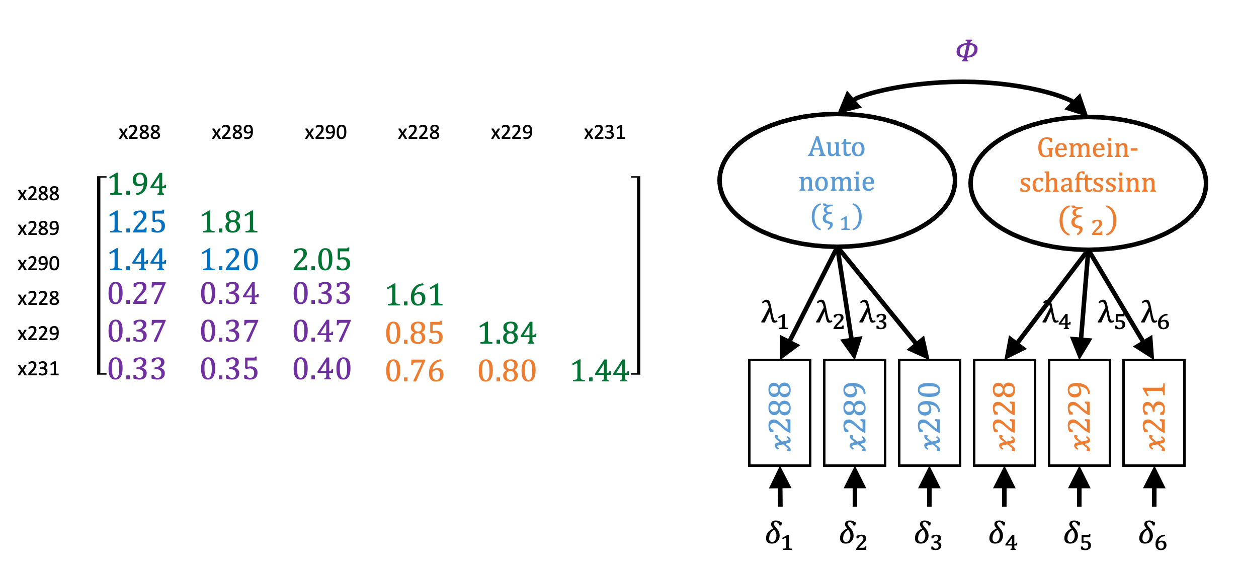 - Die Varianz der manifesten Variablen wird durch unterschiedliche Ausprägungen in der zugrunde liegenden latenten Variablen bestimmt und Abweichungen gehen auf Messfehler (\(\delta\)i) zurück. Die Varianzen der manifesten Variablen, die wir der latenten Variable Autonomie zuordnen, betragen zwischen 1.81 und 2.05 (grün markiert in der Diagonalen oben links).