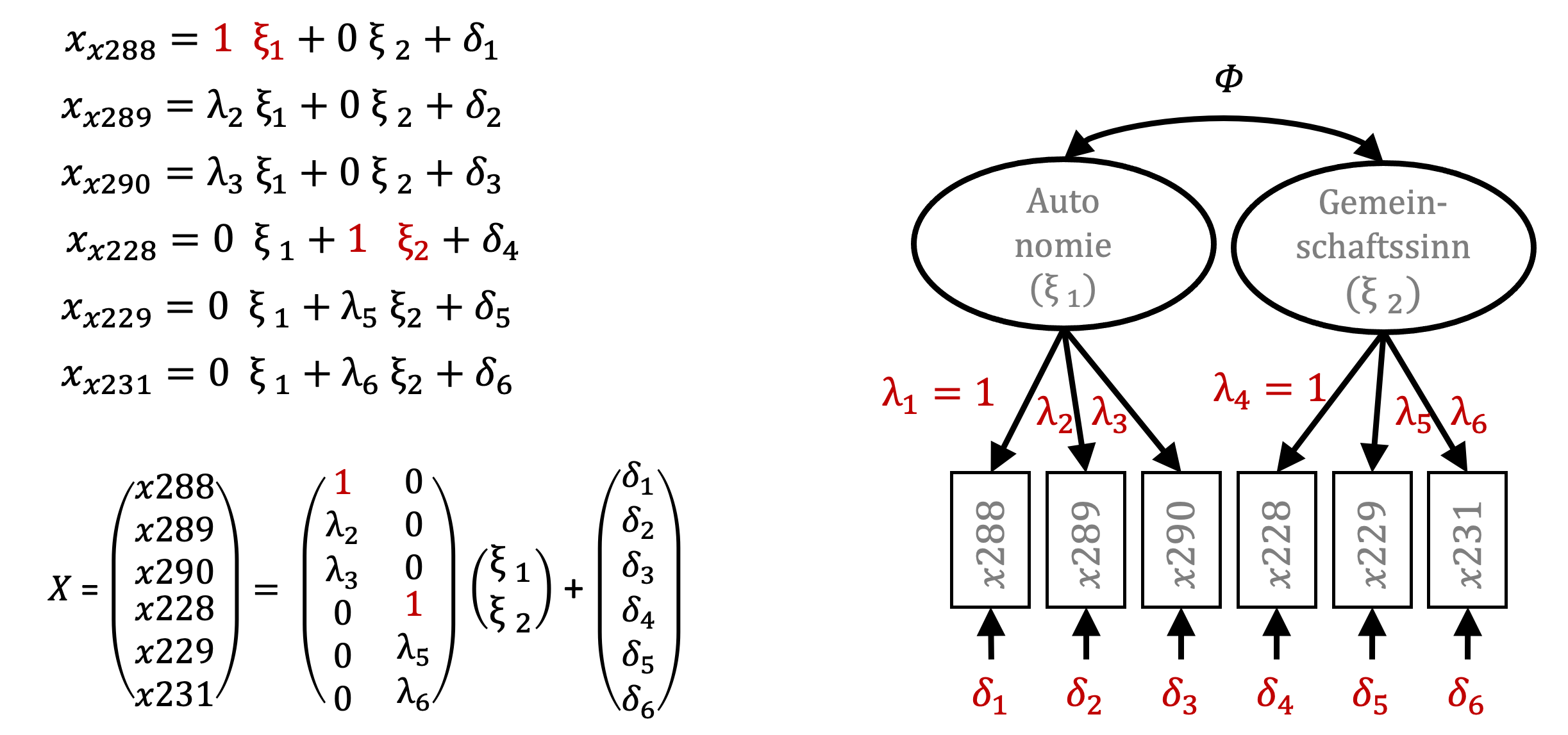 Das Messmodell entspricht hierbei dem folgenden Gleichungssystem (Bollen & Pearl, 2013; Jöreskog et al., 2016): \[ x_i=\alpha_X + \Lambda\xi_i+\delta_i \] Für die angenommenen zwei zugrunde liegenden latenten Variablen (Autonomie und Gemeinschaftssinnn) resultiert für jede Variable in der Datenmatrix (den Bewertungen zu den Items durch die Befragten) eine Gleichung der Form: \[ x_{x288}=\alpha_{x288} + \lambda_{x288} \xi_{Autonomie} + \lambda_{x288}\xi_{Gemeinschaftssinn}+ \delta_{x288} \]