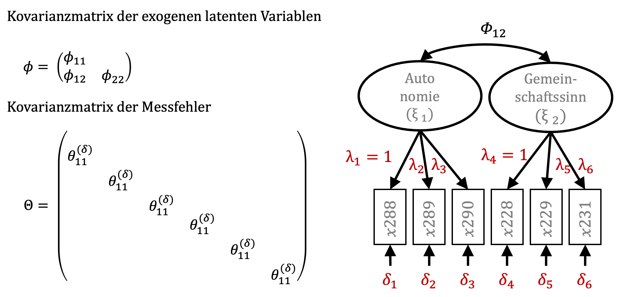 Im gegebenen Modell sind sechs Pfadkoeffizienten \(\lambda\), sechs Messfehlerterme \(\delta\) sowie die Kovarianz der latenten Variablen (\(\Phi\)) zu bestimmen. Es sind also 13 Parameter zu schätzen und die Kovarianzmatrix enthält sechs Varianzen und 15 Kovarianzen. Das Modell ist somit identifizierbar. Da die latenten Variablen nicht messbar sind, weisen sie keine Skalierung auf. Die Methode, die typischerweise von Programmen zur Strukturgleichungsmodellierung verwendet wird, ist die Festlegung des Pfadkoeffizienten \(\lambda\) für den ersten manifesten Indikator jeder latenten Variable auf einen Wert von eins (Jöreskog et al., 2016, S. 345).