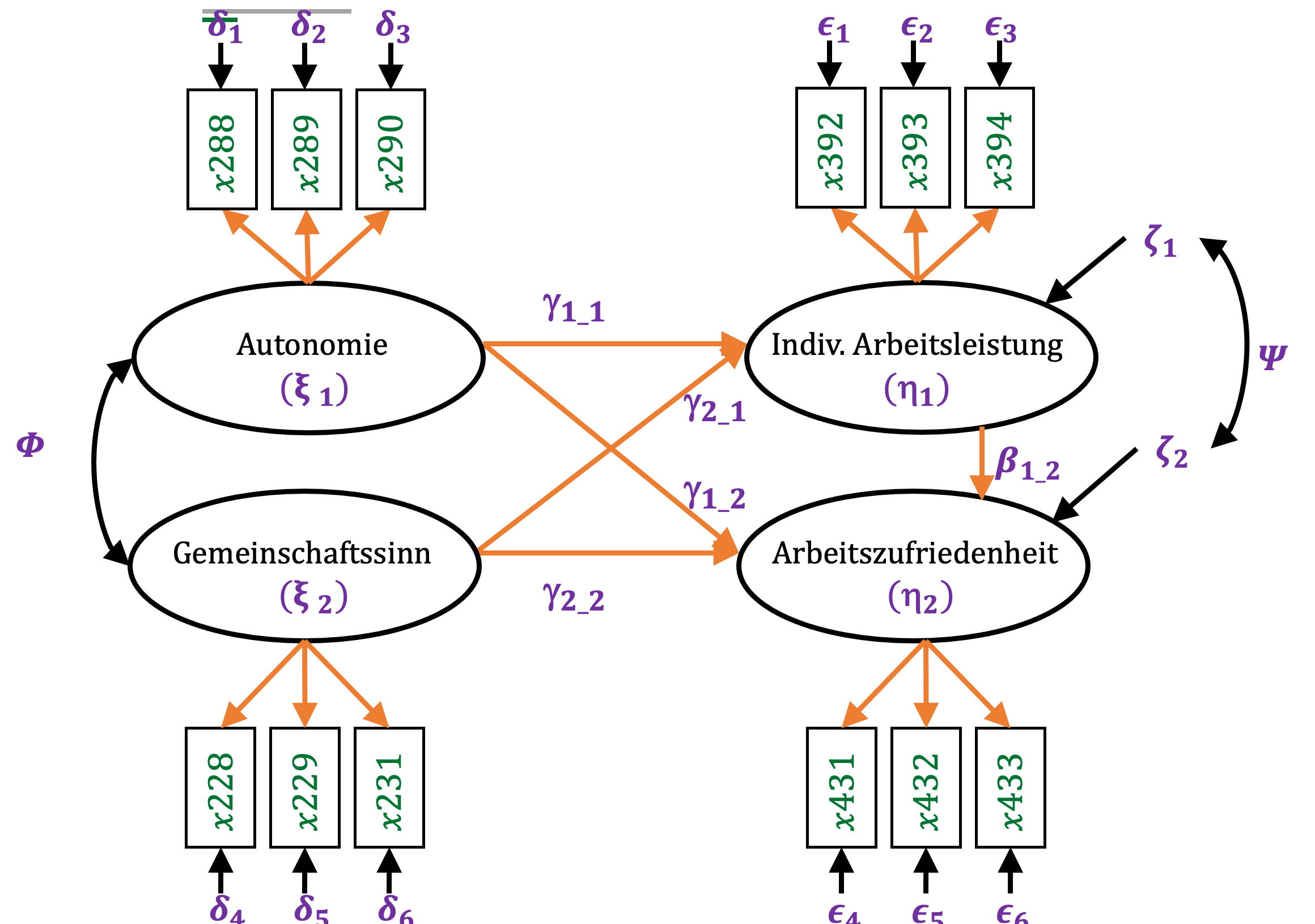 Die zu schätzenden Parameter sind hier violett dargestellt. Es handelt sich um die Werte für die latenten exogenen Variablen und die latenten endogenen Variablen. Außerdem wird die Kovarianzmatrix Phi \((\Phi)\) der exogenen latenten Variablen bestimmt, die Kovarianzmatrix Psi \((\Psi)\) der nicht durch das Modell erklärten Varianzanteile zeta \((\zeta)\) der endogenen latenten Variablen, sowie die Kovarianzmatrizen der Messfehler der manifesten Variablen der exogenen latenten Variablen delta \((\delta)\) und der Messfehler der manifesten Variablen der endogenen latenten Variablen Epsilon \((\epsilon)\).