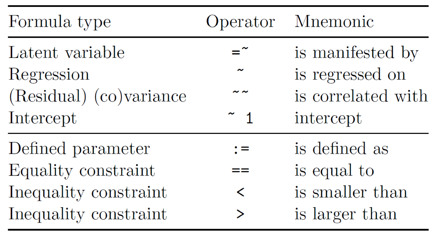 Das sind wenige, aber die grundlegend notwendigen ‘Operanten’ die Sie kennen müssen, um die grafisch dargestellte Beziehung in ein ‘Lavaan’-Modell zu übertragen.