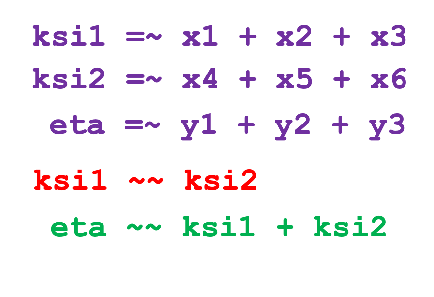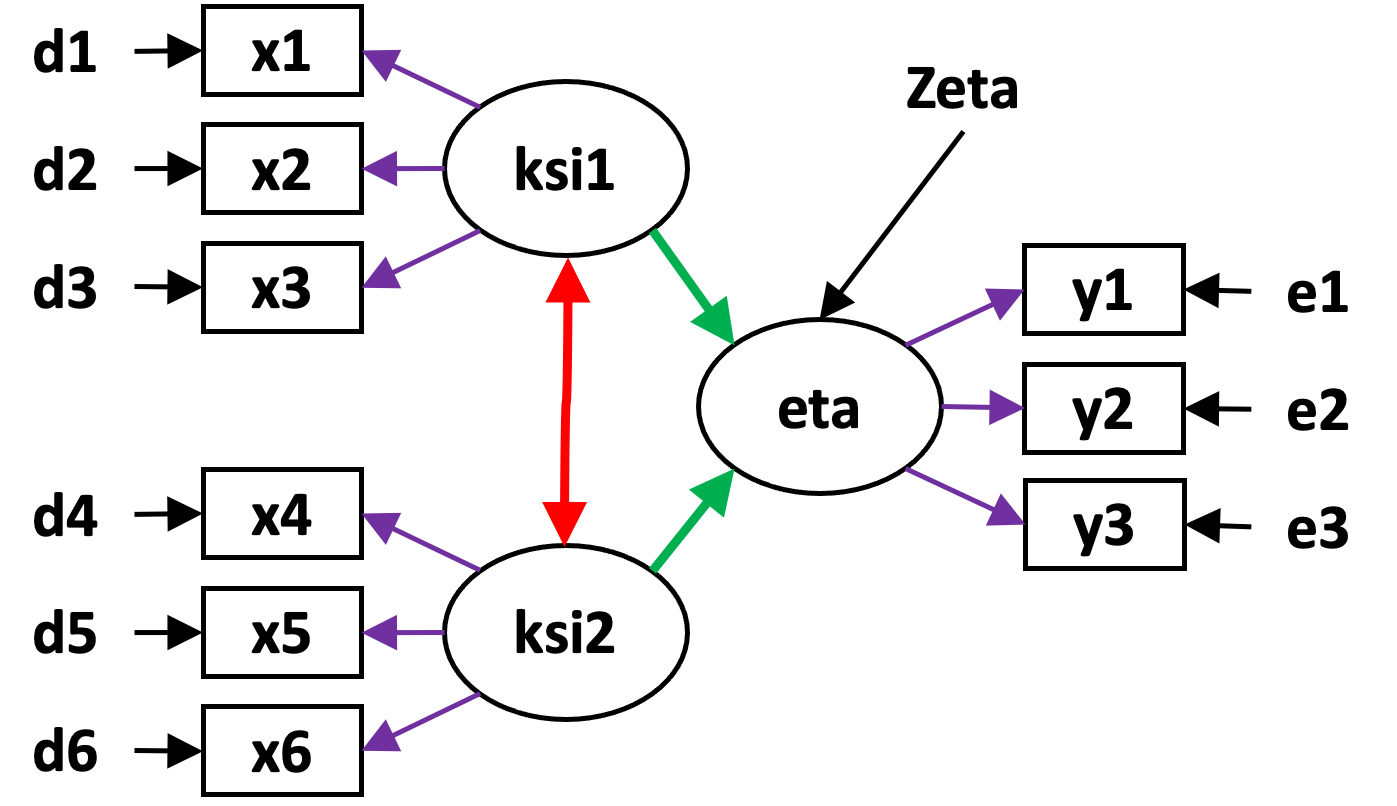 In der Regel sollte eine latente Variable immer durch drei manifeste Variablen operationalisiert werden. Ich habe hier ein Modell mit drei latenten Variablen, genau genommen sind in diesem Modell zwei exogene latente Variablen, die mit ‘ksi1’ und ‘ksi2’ bezeichnet sind und eine endogene latente Variable, mit ‘eta’ bezeichnet. Jeder latenten Variable werde ich hier jeweils drei manifeste Variablen zuordnen.