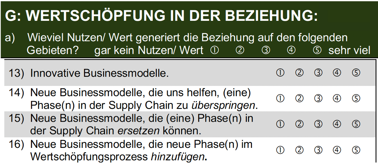 Beispielhaft werden wir hier die Geschäftsmodellinnvation (Business-Modell-Innovation; BMI) als Erfolgsvariable der Kooperation ansehen. Die Messung von BMI geht hier auf Bouncken & Fredrich (2016) zurück. Genau genommen messen die Aussagen die Wertschöpfung für BMI in der Beziehung.