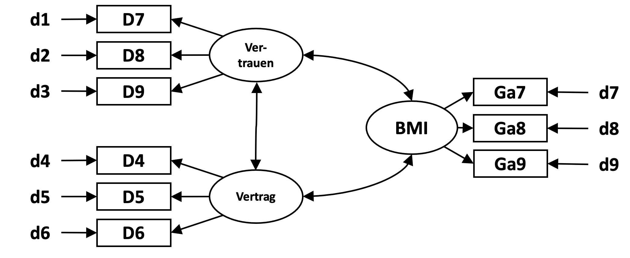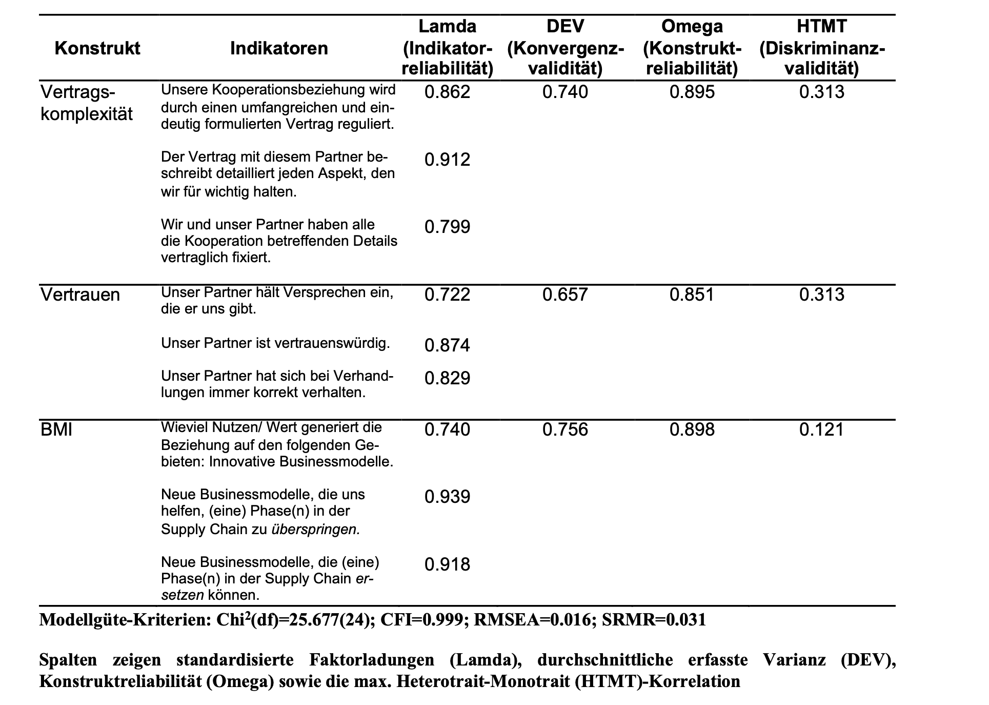 Die standardisierten Faktorladungen der Indikatoren von Vertragskomplexität betragen in diesem Beispiel 0.862, 0.912 und 0.799; die von Vertrauen betragen 0.722, 0.874 und 0.829. Für BMI betragen die standardisierten Faktorladungen 0.740, 0.939 und 0.918.Sie zeigen auf den ersten Blick, wie gut die Indikatoren das latente Konstrukt repräsentieren.