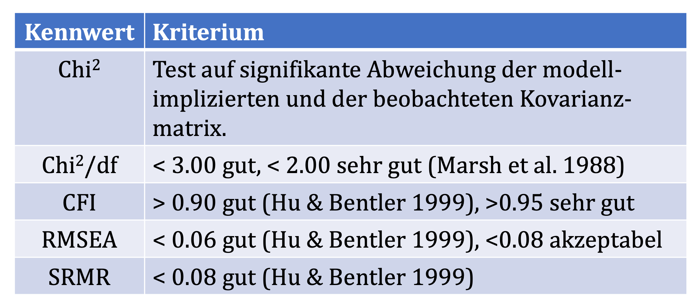 Über die Güte eines Modells entscheidet ein chi2-Test, der die empirische Kovarianzmatrix der manifesten Variablen mit den Prognosen der theoretischen Kovarianzmatrix vergleicht. Weist der chi2-Test ein signifikanten p-Wert auf, passen die theoretischen Annahmen nicht so gut zu der empirischen Kovarianzmatrix der manifesten Variablen.