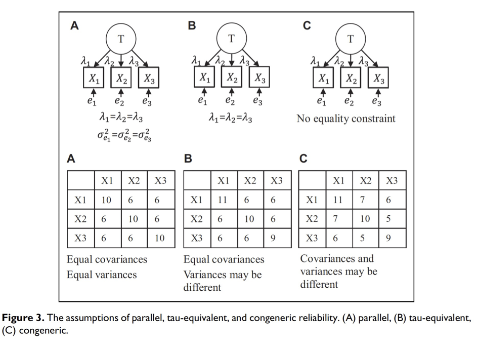 Hier möchte ich eine Übersicht von Rönkkö & Cho (2020) verwenden. Das Messmodell welches ich im letzten Video vorgestellt hatte entspricht in dieser Abbildung der Variante C - dem kongenerischen Modell mit den geringsten Anforderungen an die Güte des Messmodells.