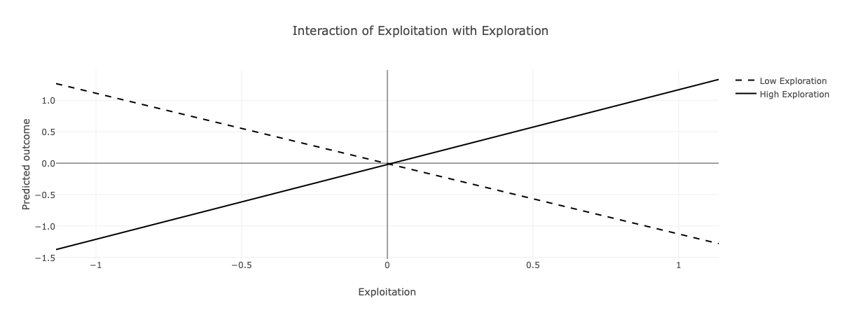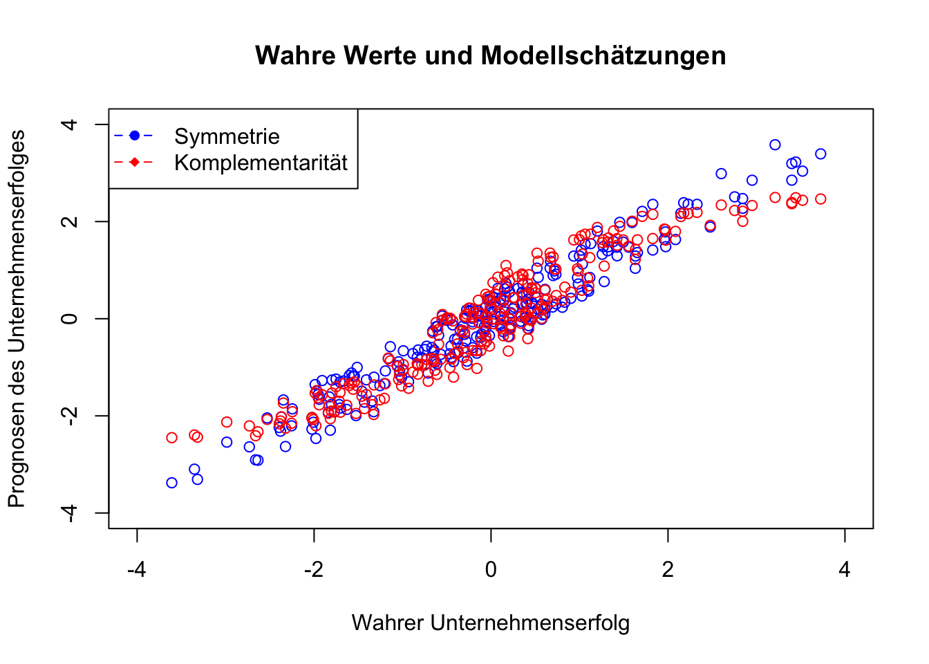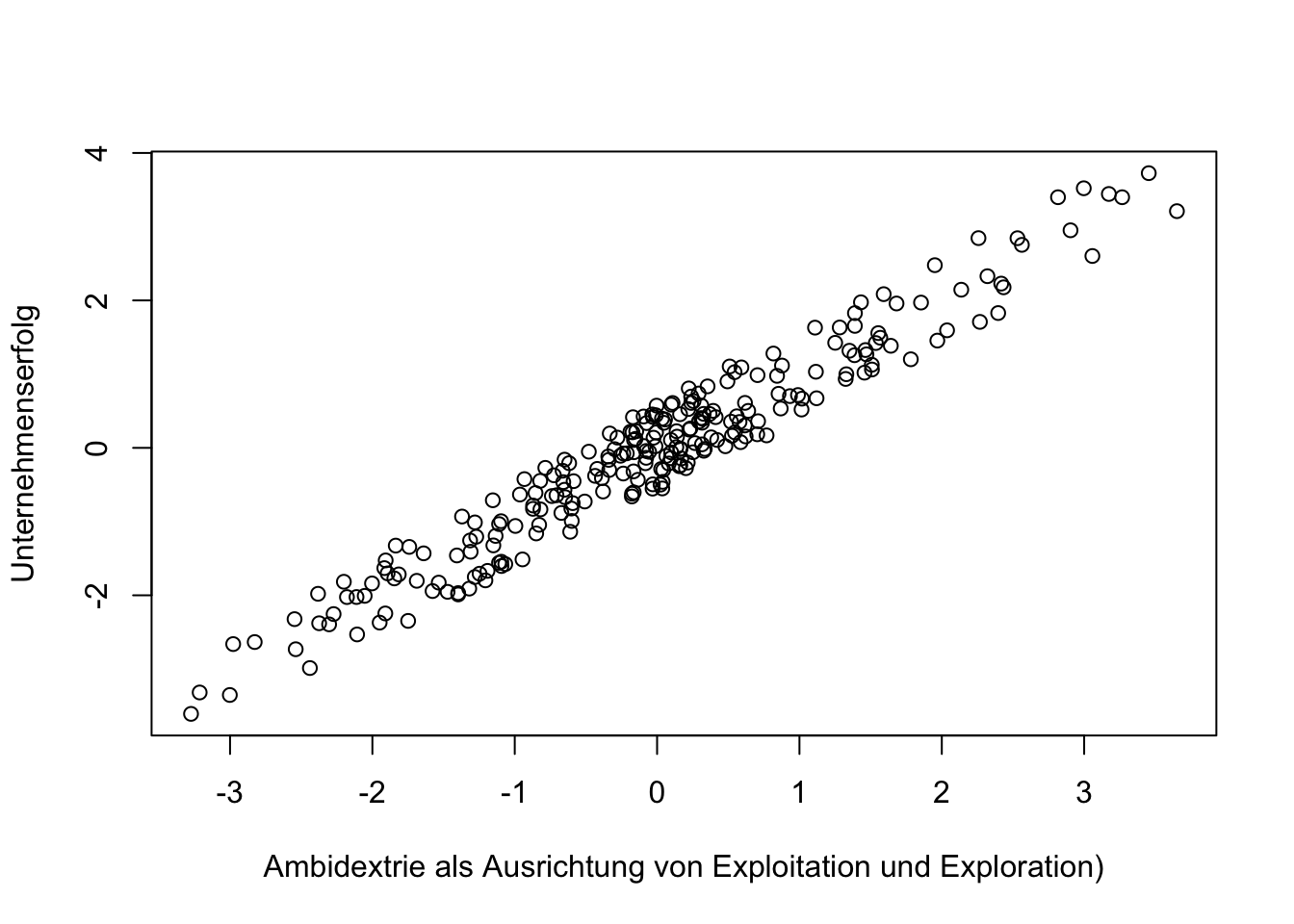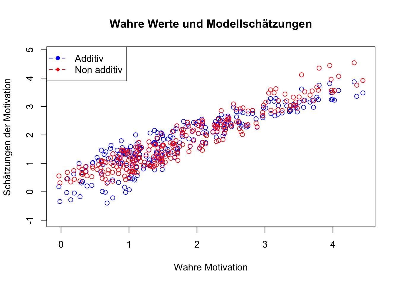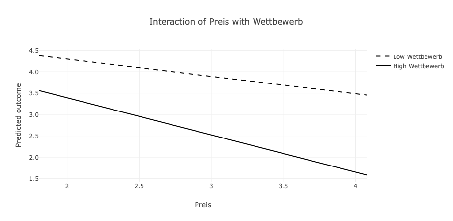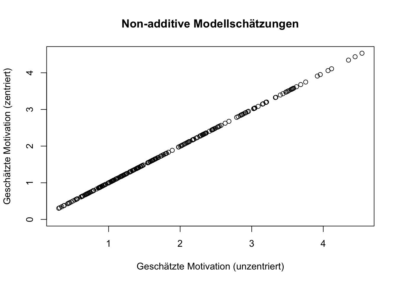 Die geschätzten Koeffizienten von Wert beschreiben nun den Beitrag von Wert zu Motivation, bei eineR durchschnittlichen Ausprägung von Erwartung. Umgekehrt zeigt der geschätzte Koeffizient von Erwartung nun den Beitrag, den Erwartung zu Motivation aufweist, wenn der Wert eine durchschnittliche Ausprägung aufweist. Die Einbeziehung des Produktterms führt in diesem Regressionsmodell zu einer höheren internen Validität, indem sie die ceteris-paribus-Bedingung aufzeigt, also der Tatsache, dass unterschiedliche Konsequenzen (bzw. Ausprägungen einer abhängigen Variable) auf unterschiedliche Ursachen (Ausprägungen der unabhängigen Variable) zurückgeführt werden können.