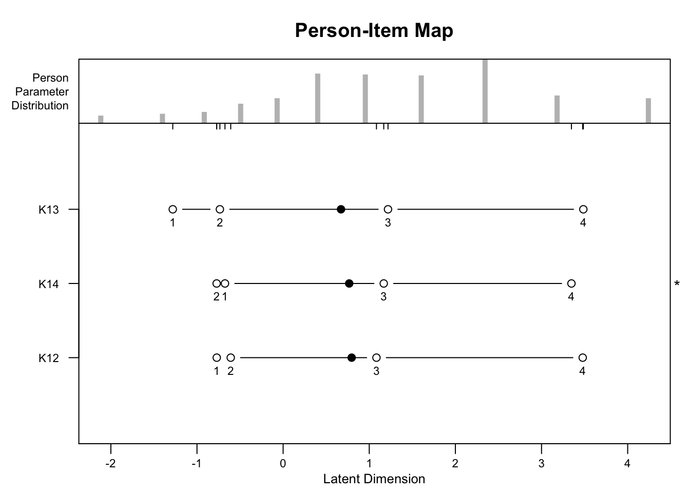 Das Regressionsmodell schätzt die Koeffizienten auf Grundlage der unabhängigen Variable (\(x\)), des Moderators (\(z\)) und des Produktterms (\(xz\)). Die typischen Interaktionsplots von Dawson (2014) eignen sich nicht, weil sie nicht den moderierten Effekt von X auf Y darstellen, sondern die Prognose der abhängigen Variable \(\hat{y}\) auf Grundlage der unabhängigen Variable (\(x\)), des Moderators (\(z\)) und ihres Produktterms (\(x \cdot z\)). \[ \hat{y}=\beta_0 + \beta_1x+\beta_2z+\beta_3xz\] \(\beta_1\) zeigt hier den Beitrag von \(x\) zu \(\hat{y}\) auf, wenn \(z\) einen Zahlenwert von Null aufweist. Weil in diesem Beispiel keine Zentrierung vorgenommen wurde und der Zahlenbereich von \(1.01 ≤ z ≤ 4.99\) reicht, ist die Annahme \(z=0\) eine rein theoretisch-mathematische Information.