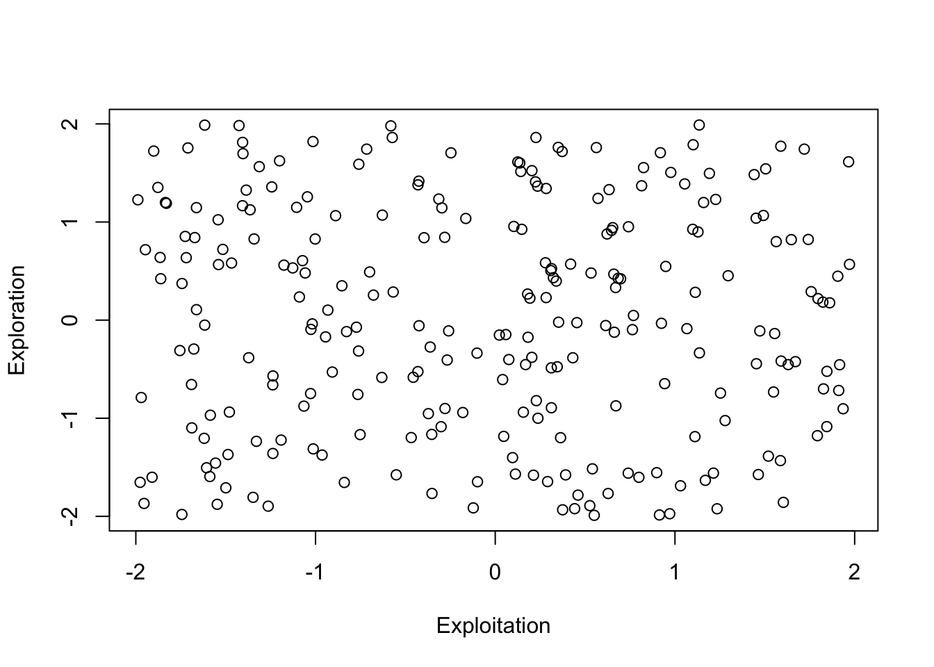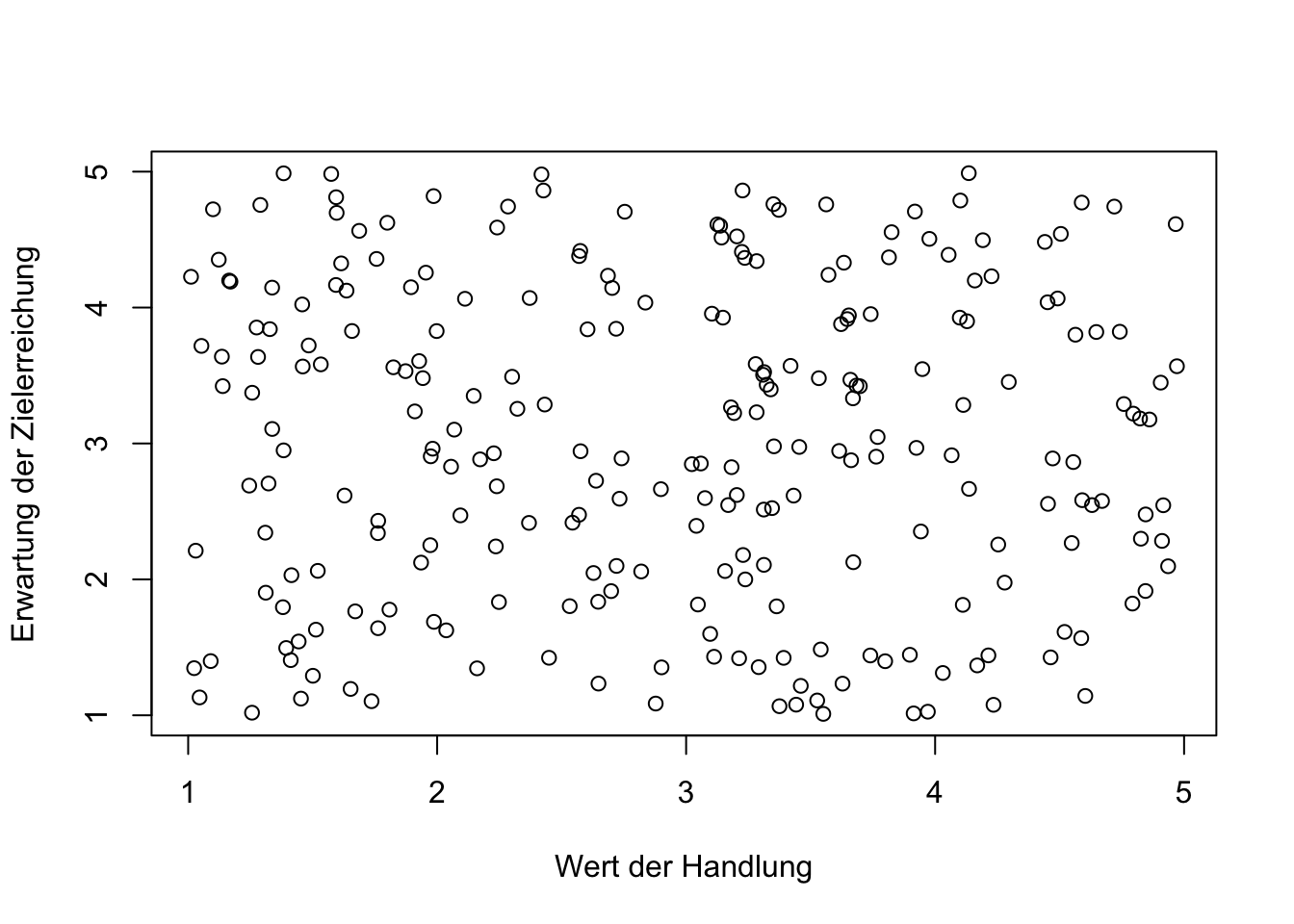 Obwohl “Wert” und “Erwartung” nicht korrelieren (siehe die folgende Abbildung), sind sie in Bezug auf die abhängige Variable Motivation verbunden. Gemäß der Ausdrucksweise von Pearl (2009a) sind diese Variablen sogenannte Collider”*. Sie sind im Modell über die Motivation miteinander verbunden und dies kann mit verzerrten Koeffizientenschätzungen einhergehen. Diese Verzerrung kann durch die Einbeziehung ihrer Interaktion als Produktterm \(Wert \cdot Erwartung\) in die Regressionsgleichung korrigiert werden.