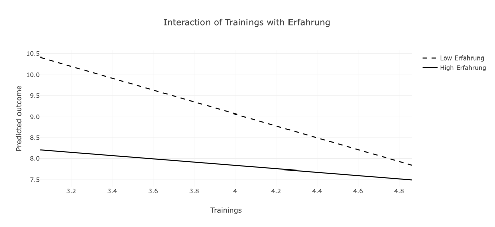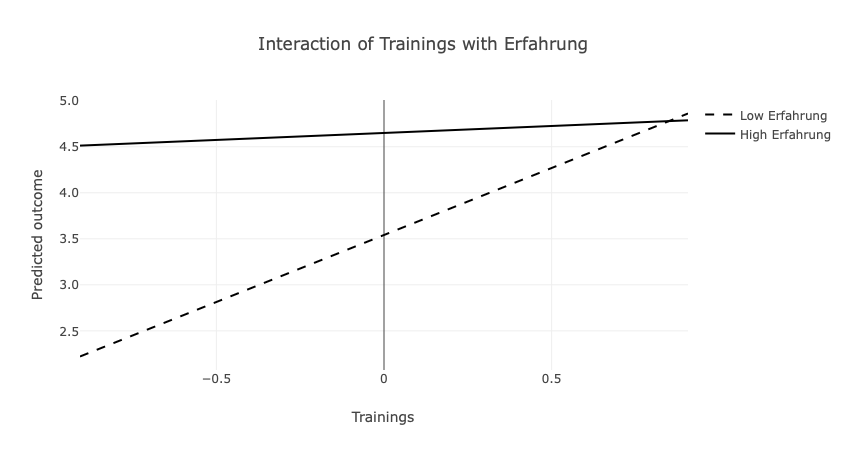 Der positive Beitrag von Trainings auf Kompetenz nimmt demnach mit steigender Vorerfahrung ab und erreicht bei den hohen Werten in Erfahrung (\(\overline z + SD_z\)) einen Beitrag zu \(\hat y\) von nahezu Null (0.15).