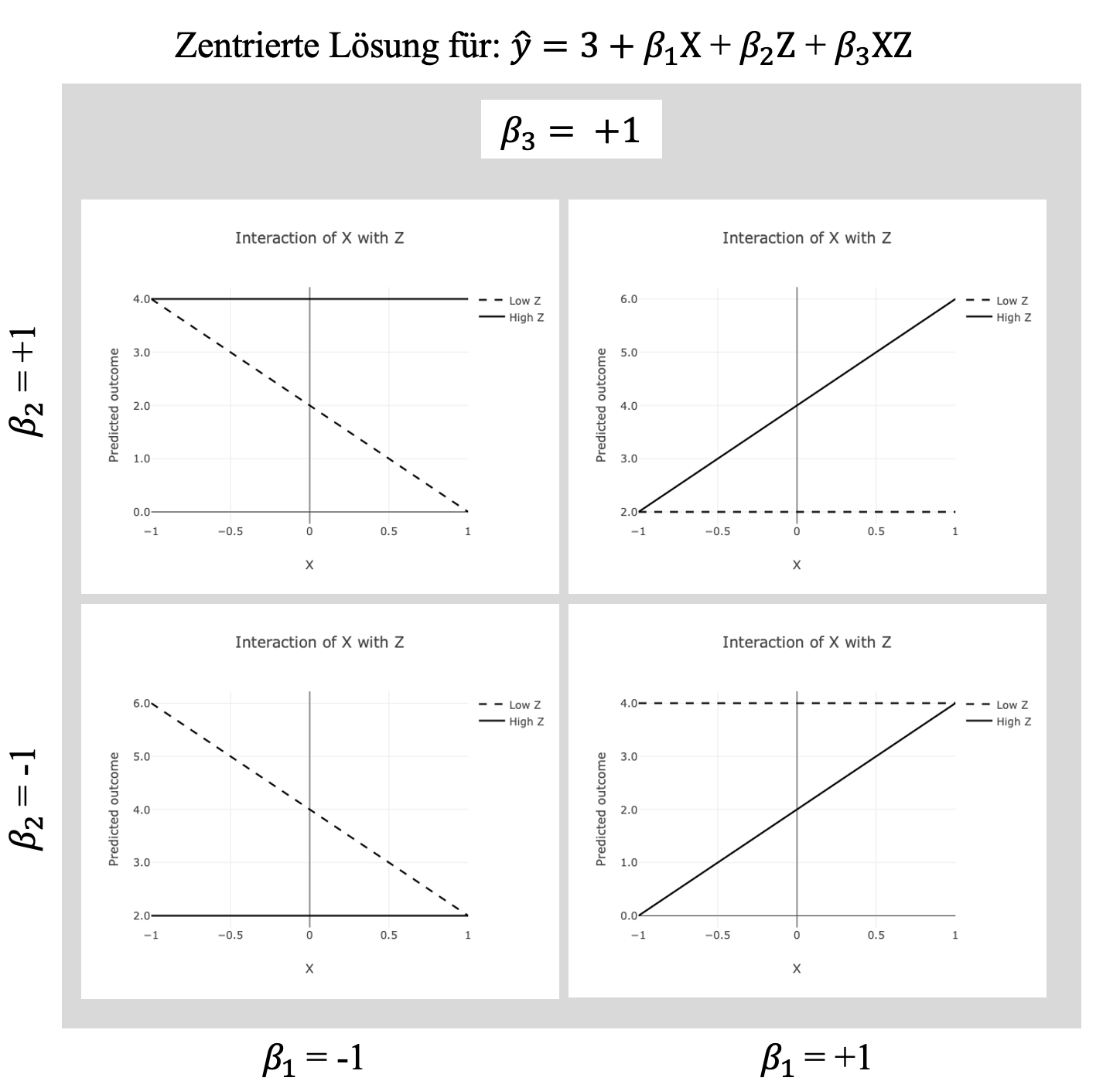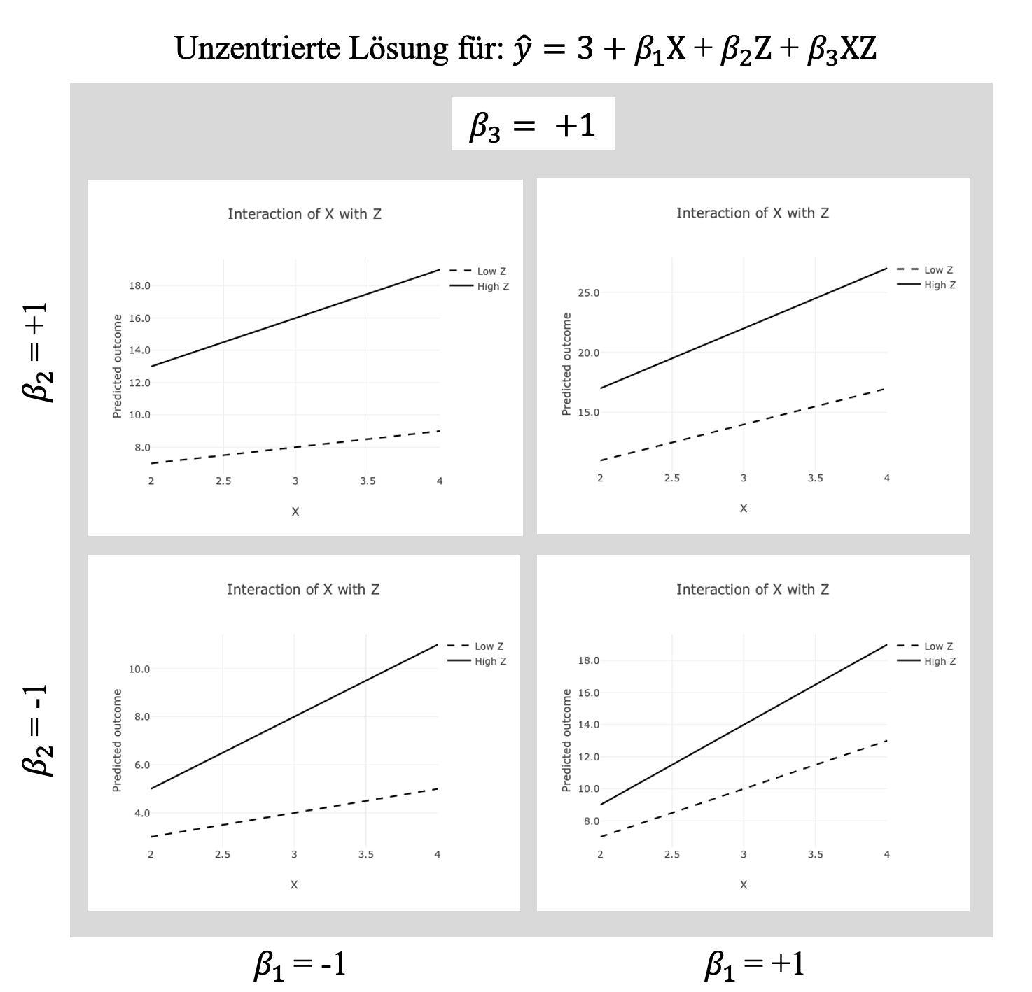 Vorausgesetzt \(\beta_3 \neq 0\), weist die Gleichung für unterschiedliche Ausprägung von \(Z\) variierende Beiträge von \(X\) zu \(Y\) auf.
