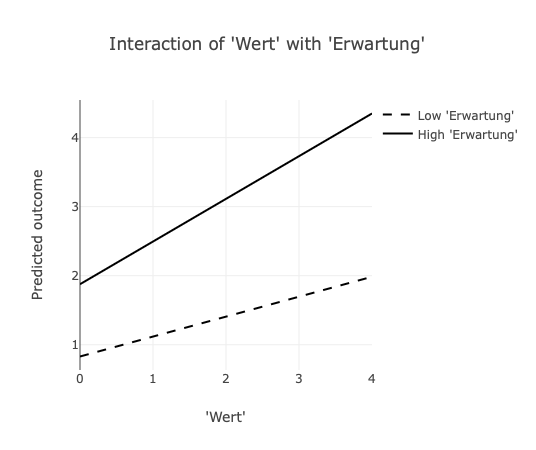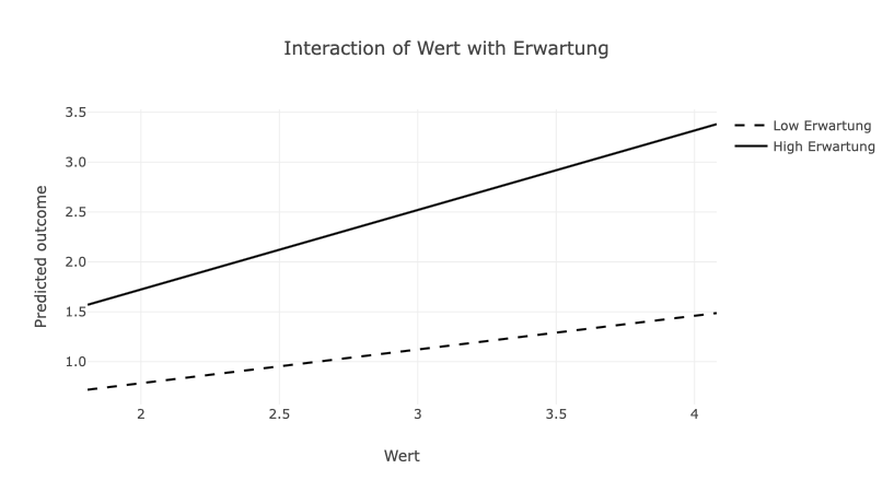 Das Ergebnis der Interaktionsanalyse zeigt einen signifikanten Koeffizienten für den Interaktionsterm auf. Aus der folgenden Abbildung geht hervor, dass “Wert” und “Erwartung” eine komplementäre Wirkung auf die Motivation aufweisen. Wenn nur eine der beiden Bedingungen hoch ausgeprägt ist, erreicht die Motivation lediglich moderate Beträge (\(\approx 1.5\)). Nur unter der Bedingung, das beide Aspekte (Erwartung und Wert) hoch ausgeprägt sind, resultiert Motivation mit einem Betrag in Höhe von \(\approx 3.5\).