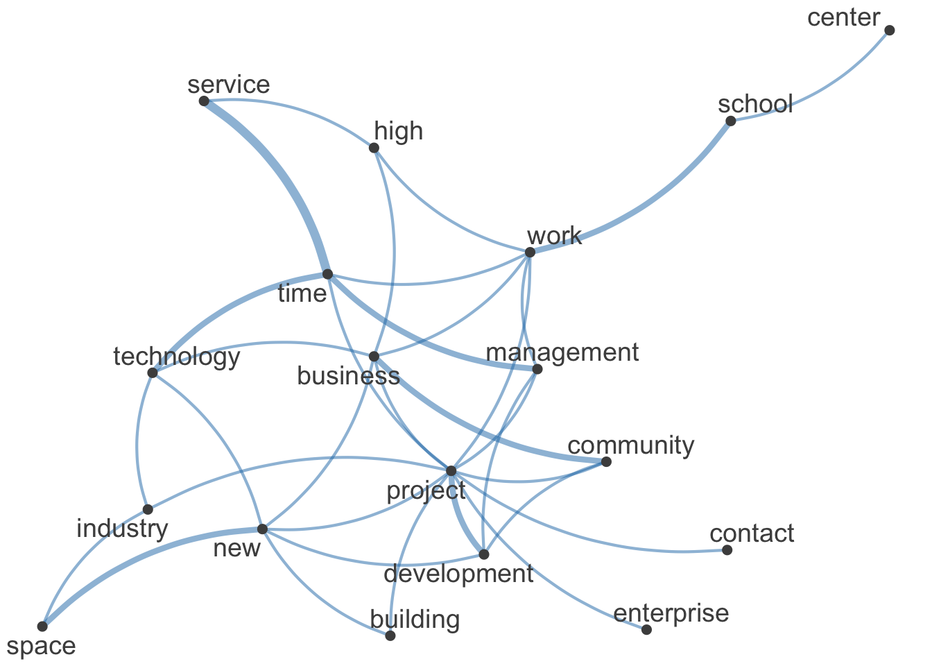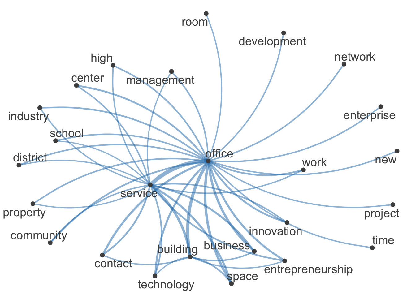 Die Matrix zeigt beispielsweise auf, dass “Office” häufiger gemeinsam mit “Network” auftritt (691731), als mit “Rental” (432141). Die folgende Darstellung zeigt die 20 häufigsten Worte aus der vorausgegangenen Wortwolke. Die Stärke der Verbindungslinien bezeichnet die Häufigkeit des gemeinsamen Auftretens.