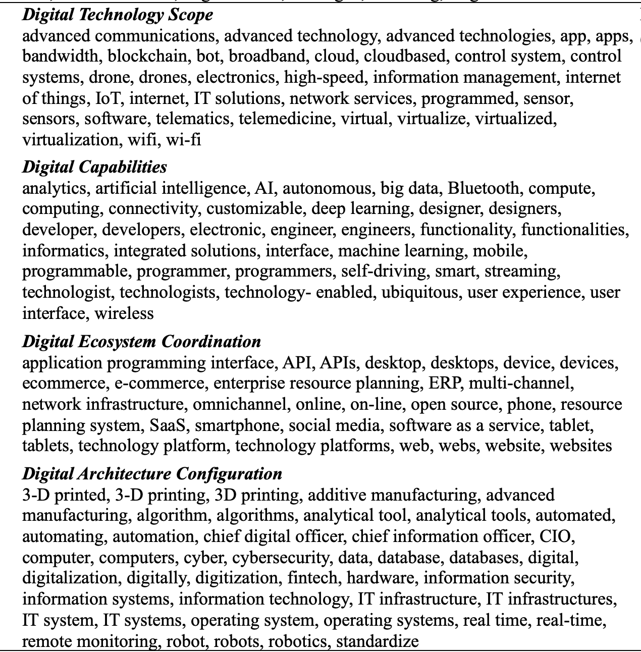 So beschreiben Kindermann et al. (2020) eine inhaltsbasierte Messung von Digitaler Orientierung im unternehmensstrategischen Kontext. Die relative Häufigkeit des Auftretens von Schlüsselworten indiziert die Ausprägung digitaler Ausrichtung in vier Dimensionen (Digital Technology Scope, Digital Capabilities, Digital Ecosystem Coordination, Digital Architecture Configuration). Die Autoren haben eine Validierung des Konstrukts (bzw. seiner Messung) anhand der Entrepreneurial Orientation Operationalisierung von Mckenny (2016) durchgeführt.